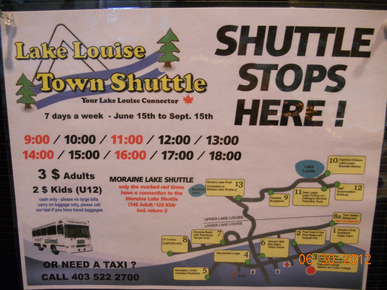 レイク・ルイーズの地元のtransportation会社が運行しているシャトルバスで、レイク・ルイーズの主要のホテルに停まります。 ホテル内にスケジュールが貼ってありました。 レイク・ルイーズ方面だけではなく、本数は少ないですが、モレーン・レイクまで行くシャトルバスもあります。 ちなみに、モレーン・レイクまで利用する場合は、往復で$14。