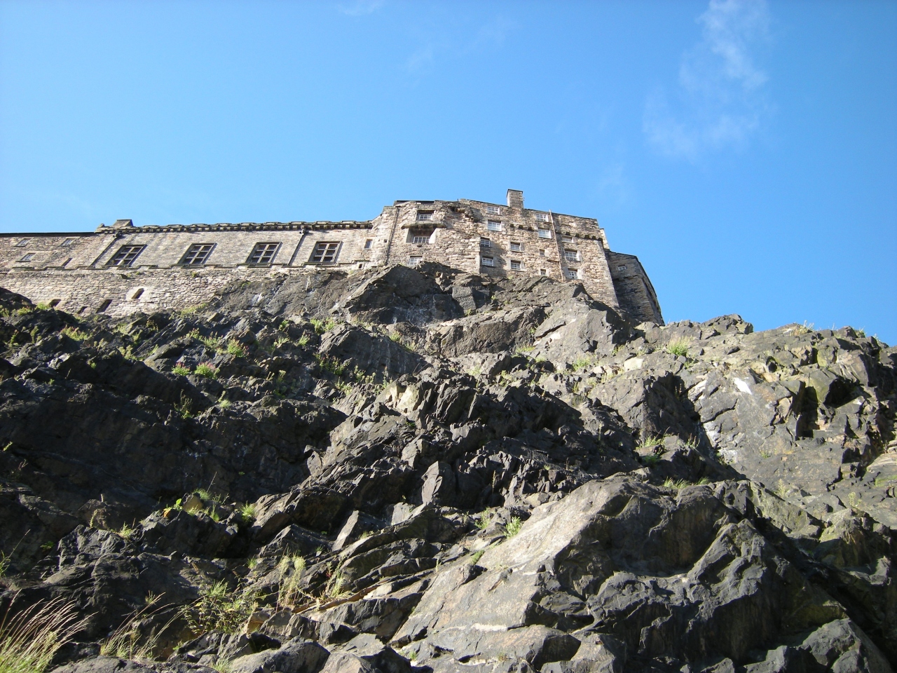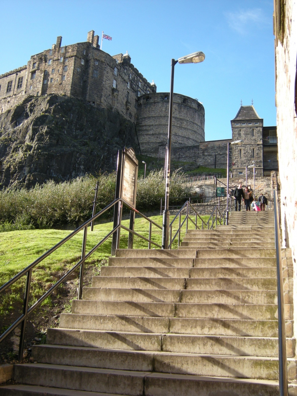 夜はパブでの喧噪が響くグラスマーケットですが昼間は公園でのんびりする人たちの憩いの場。広場の西まで行くと北側にお城がそびえ立っています。ここから100段ぐらいの緩やかな階段を上っていくとお城の最も険しい崖を見ることができます。