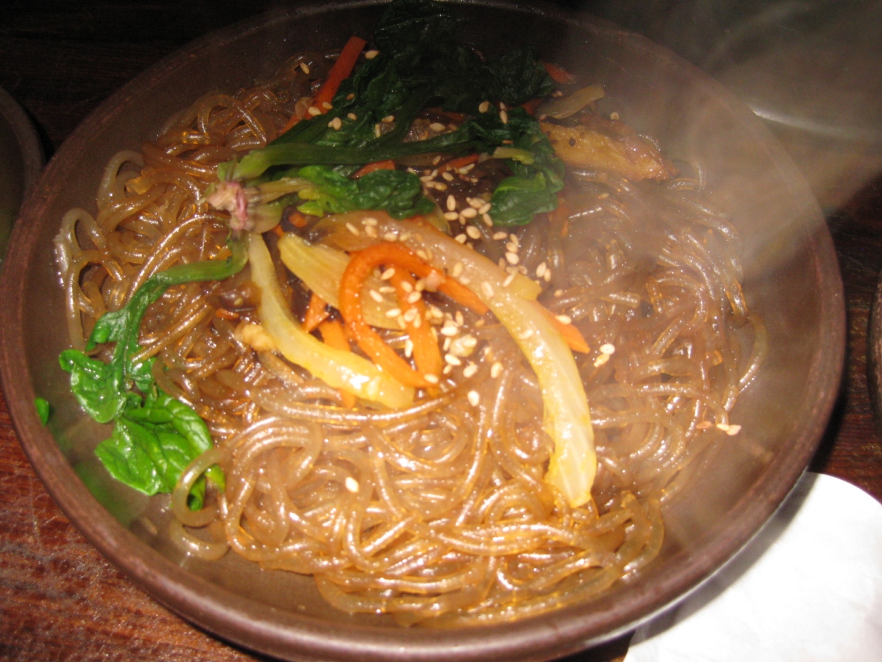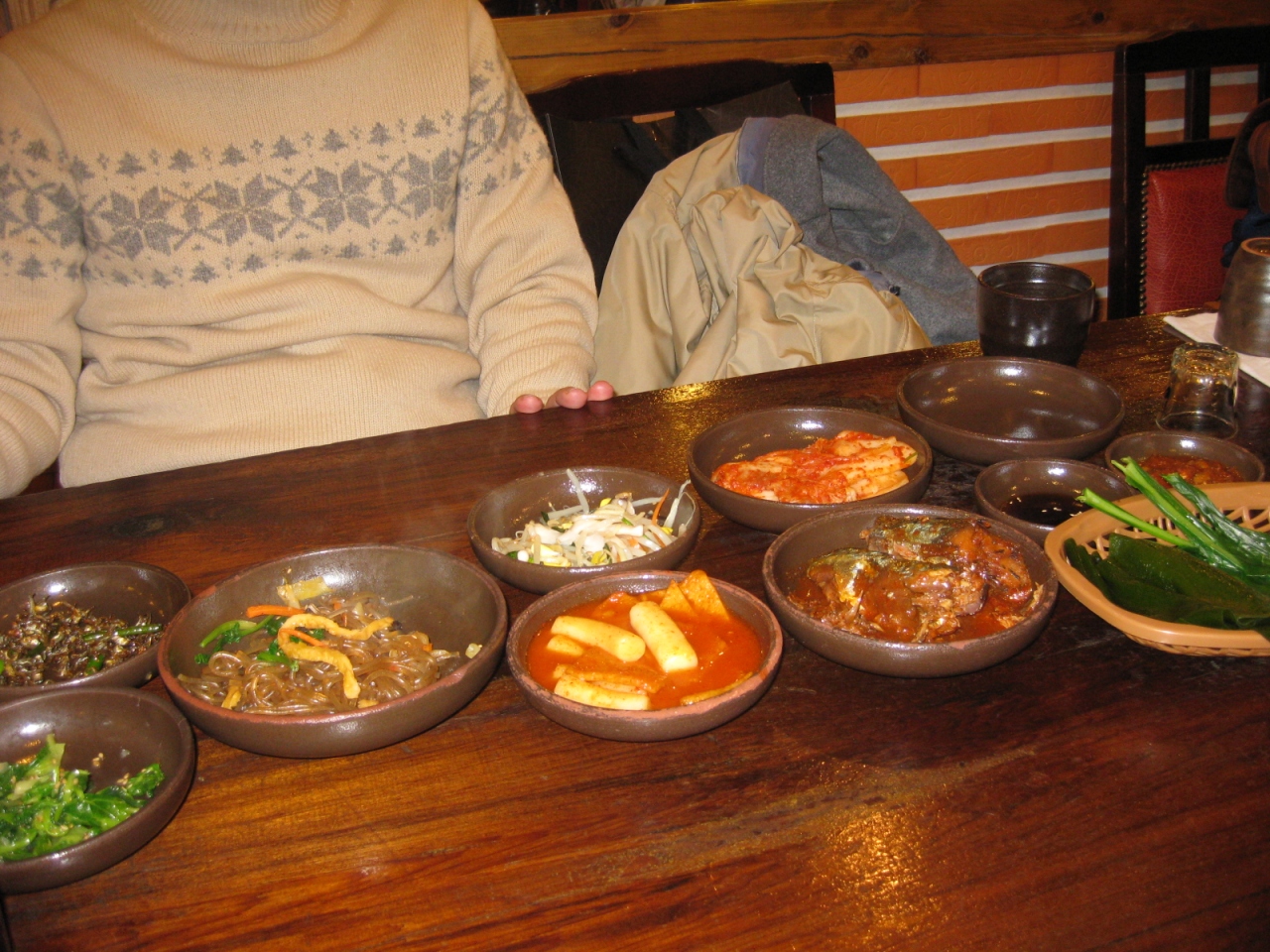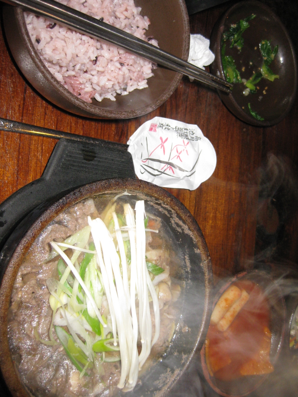 うちのだんなさんが大好きなお店。メインは、トッペギに入った一品料理ですが、それを囲むおかずの数々。正直に言うと、おかずとご飯だけでもいいかもってくらいです。なかでも、チャプチェが最高においしい。日本じゃこれだけで千円くらいするのに。もちろん、メイン以外はすべておかわりOKです。ちなみに、ご飯は雑穀入りです。