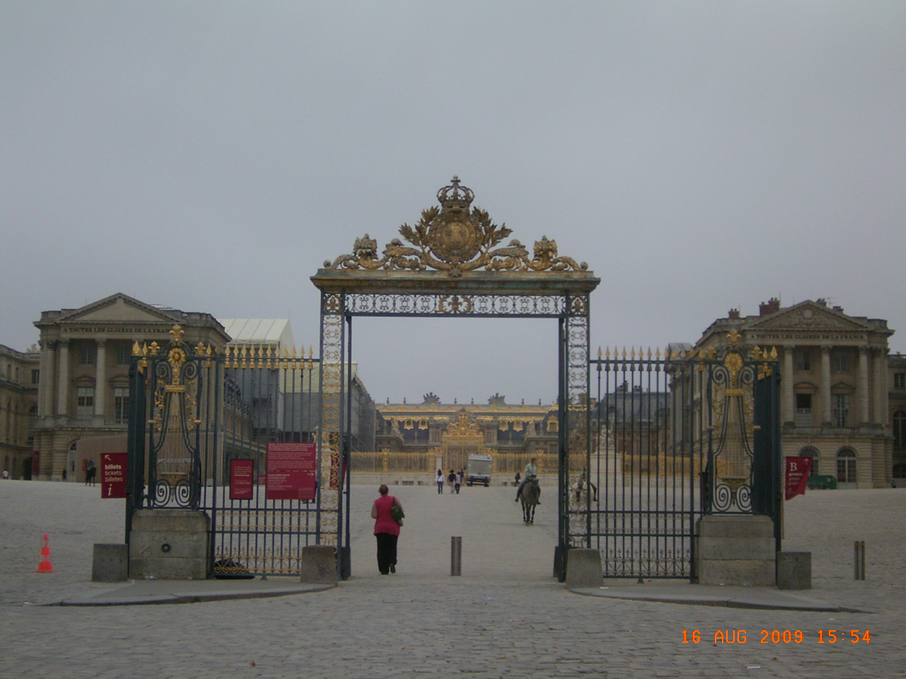 アルム広場は太陽の門(正門)からヴェルサイユ宮殿建物間の正門広場です。ルイ14世の騎馬像もあります。太陽の門は光り輝いています。ハンガリーの宮殿の門や日本の迎賓館の門もこの太陽の門を模造しています。広場も広いです。