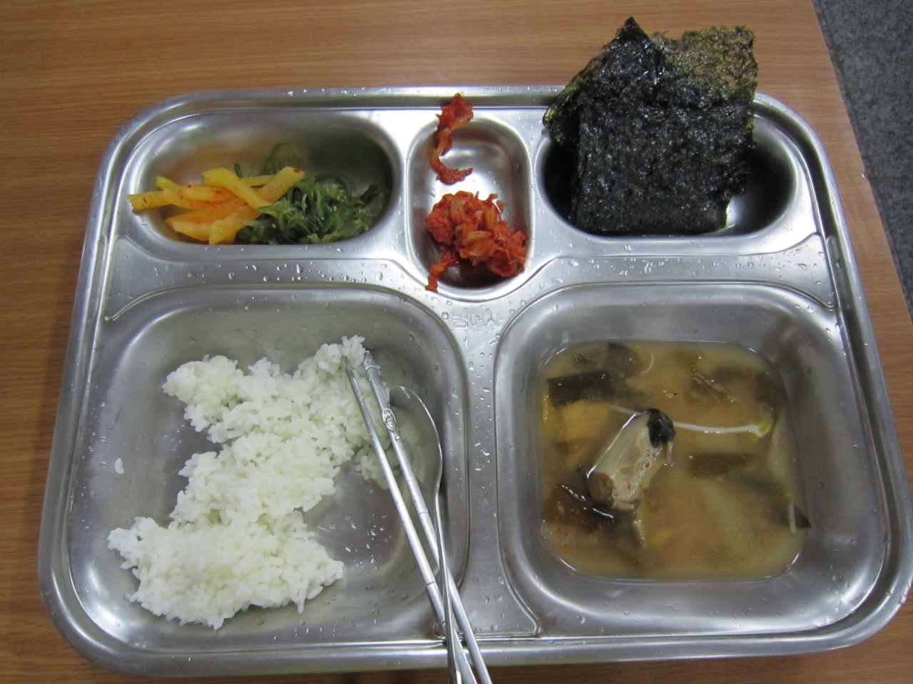 お寺のお接待だと思うのですが、無料でお昼御飯もいただくことができました。(ご飯、味噌汁、のり、キムチ、たくあん、海藻の和え物、豆もやしのナムル。精進料理です)