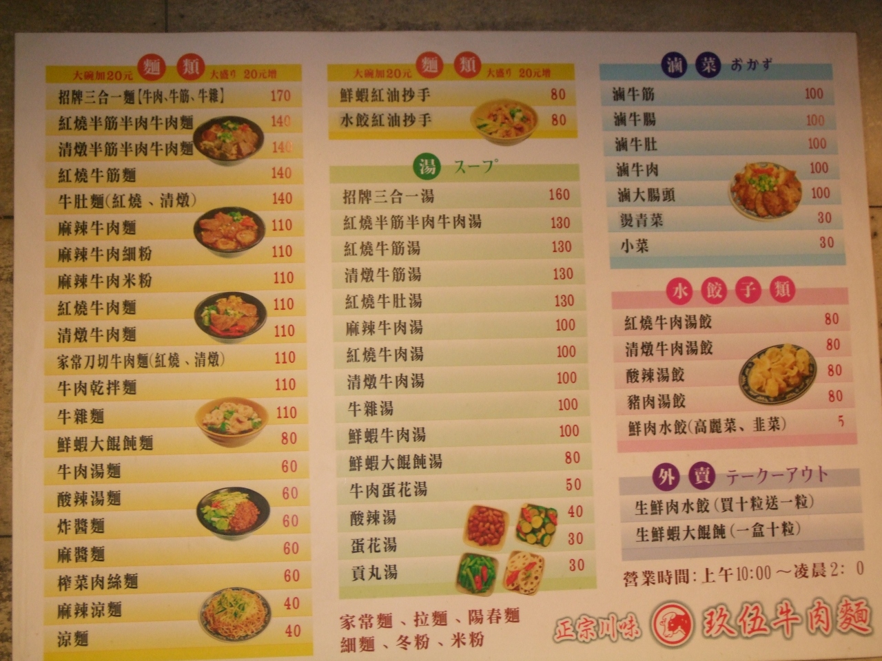 メニューが豊富です。昼から明け方近くの深夜まで営業しています。小菜やビールなどは冷蔵庫から自分で取ります。肉やモツの煮込みはまな板の所で指さし注文でOKです。1人でも適当な量に盛ってくれます。もちろん麺類やスープ類の単品だけでも問題ありません。水餃子はボリュームがあり食べたい分の個数を茹でてくれます。麺類など汁物も持ち帰りできます。甘くて冷たいお茶は飲み放題です。トイレは右側奥の突き当たり。