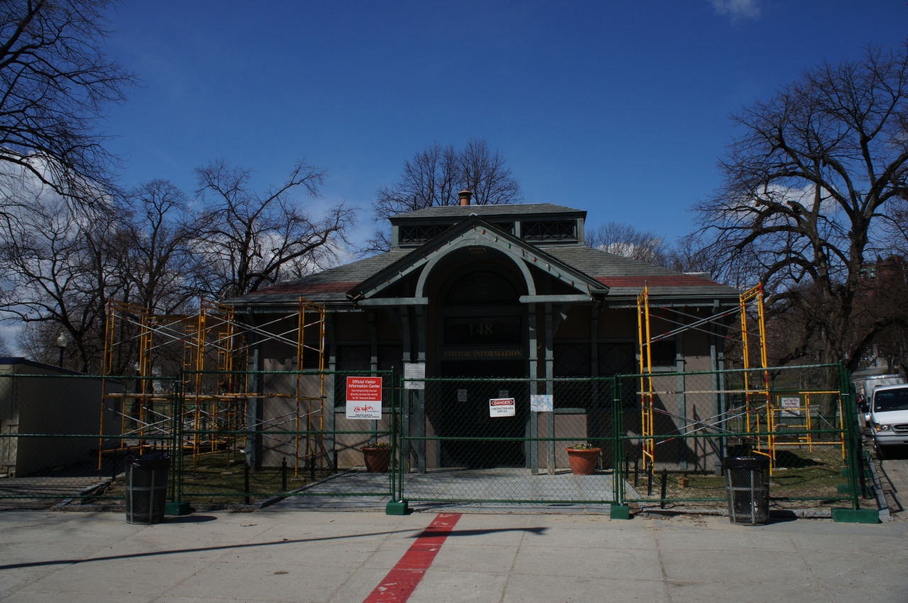 スタート地点は、ボストンコモンの観光案内所です。赤い線が路上にペイントされていて、各ポイントが結ばれています。時々、消えそうになってたり、赤いレンガが埋め込まれたりしています。