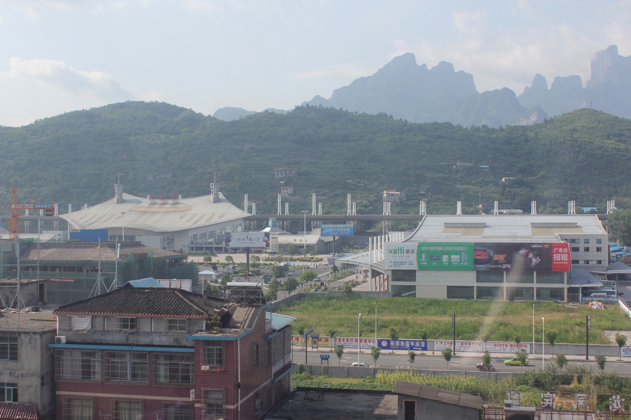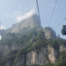 天門山へのロープウェイは張家界駅近くから出ています。その日は混んでいて、乗るまでに1時間近くは待ちました。ロープウェイは張家界の駅を越えるような形で天門山の山頂まで行きます。途中、天門山の穴が見えます。