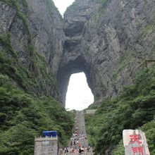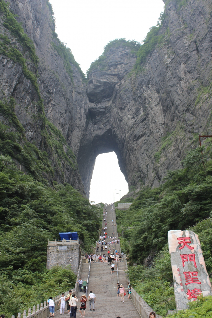 ロープウェイに乗り途中で降り、そこからバスに乗ると、天門山の穴の下に到着します。そこからは階段登りです。急な階段でです。普通の人なら登り30分、下り15分と言う所だと思います。穴の中には、ちょっとした記念碑以外何もありません。