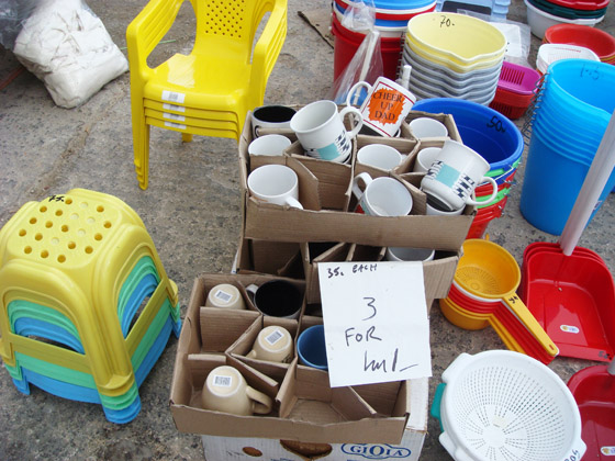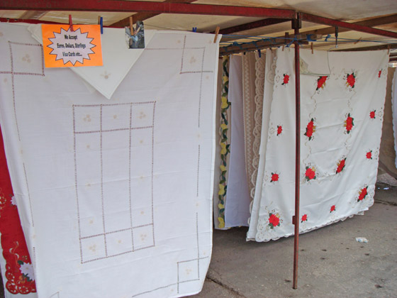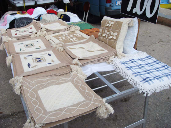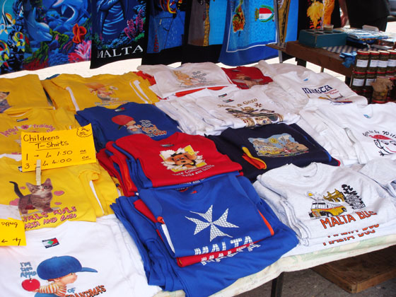特産のレースは,人のまばらな市とあって買おうとする人はなく,何気なく木陰でレースを干しているように見てとれる。それだけレースがマルタでは有名だが,カーテンのような大きなもの以外でレースを使うとしたらどこが考えられるか思い浮かばなかったので,マルタでレースを買うことはなかった。大きなキャンバス生地のトートバッグが2~4ユーロ。Tシャツは3枚,4枚とまとめ買いすると割り引かれる。Tシャツをふだんから着る人であれば重宝するかもしれない。その他では,スパイス,ワイン(周辺がブドウの産地なので),ハチミツ(ゴゾ島のものがより美味しいと思うが,マルタ島でももちろん作られている),生花,パン,マルタ菓子などが主な商品だ。日曜市は混雑するという話だが,平日のマーケットは時間帯によっては閑散としていて,観光客にとってはじっくり見られて喜ばしい。昼間でしか開いていない日曜市と違って平日は夕方までやっているので,あわてていくこともなさそうだ。