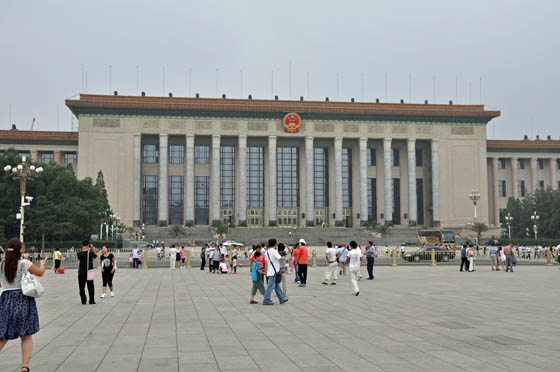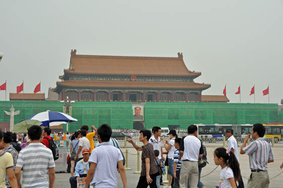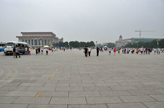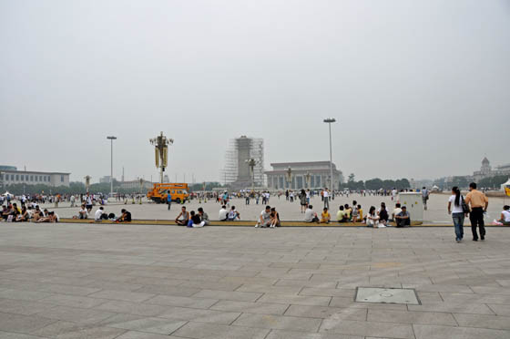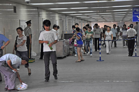 北京では,地下鉄に乗るにも荷物チェックがあるように,世界最大の広場,天安門広場に入るにも荷物チェックがある。単に中身を拝見するだけではなく,X線で透視して中を見るという空港並みの厳重?チェックである。そのわりには,皆当たり前のように和やかな雰囲気で荷物を自分で通し,機械から出てきたら受け取ってすたすたと天安門広場に入って行ってしまう。出るときはもちろんノーチェックである。天安門広場は四方を道路に囲まれていて,道路に接している部分に歩道はなく,腰ほどの高さの簡易的な塀がぐるっと一周しているので,チェックゲート以外からは入りにくい。ゲートとゲートの間はかなり離れているが,監視カメラがあるだろうから,入ることは容易ではない筈だ。