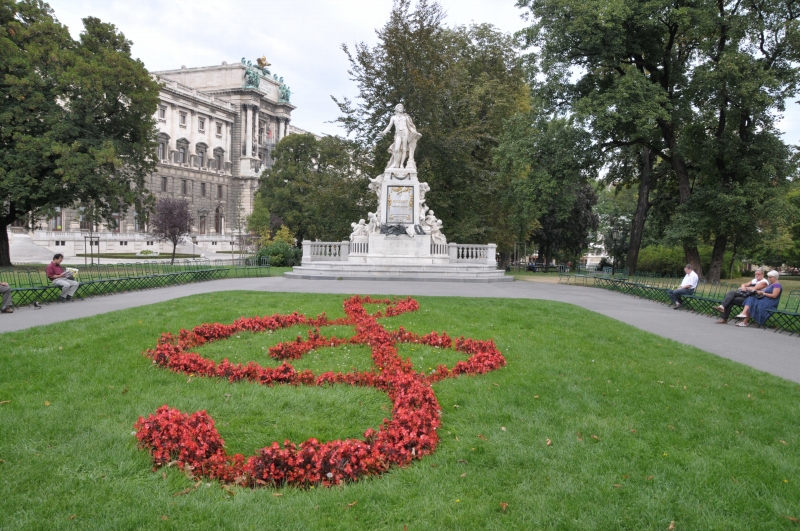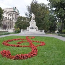 ウィーンの中心部のリンクに面したブルク公園にある銅像です。ちょうど新王宮の裏手になります。モーツァルト像の前には赤いチューリップで描かれたト音記号があります。このト音記号とモーツァルト像を入れて記念撮影をするのがウィーン観光の定番でしょう。