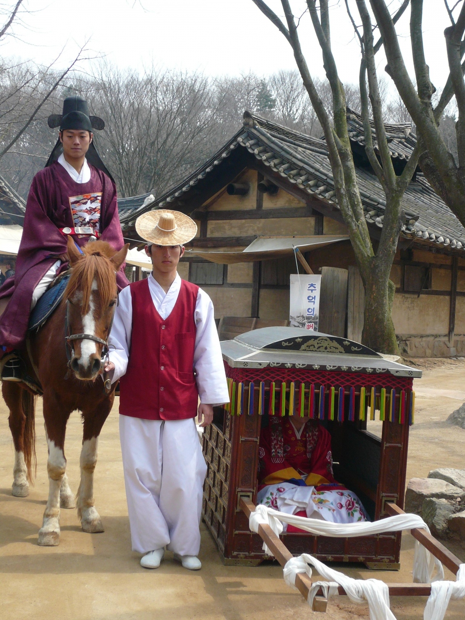 民俗村では、時間ごとにいろいろな催しが開かれていたので、時間をチェックして、それらの催し物を見学しました、写真にあるのは伝統的な結婚式と民俗舞踊です。そのほか綱渡りや、馬の曲芸などがあり楽しめました。見るべき建物も多く、食事どころには手ごろでいろいろな韓国の料理があり、おいしくお昼を食べました。
