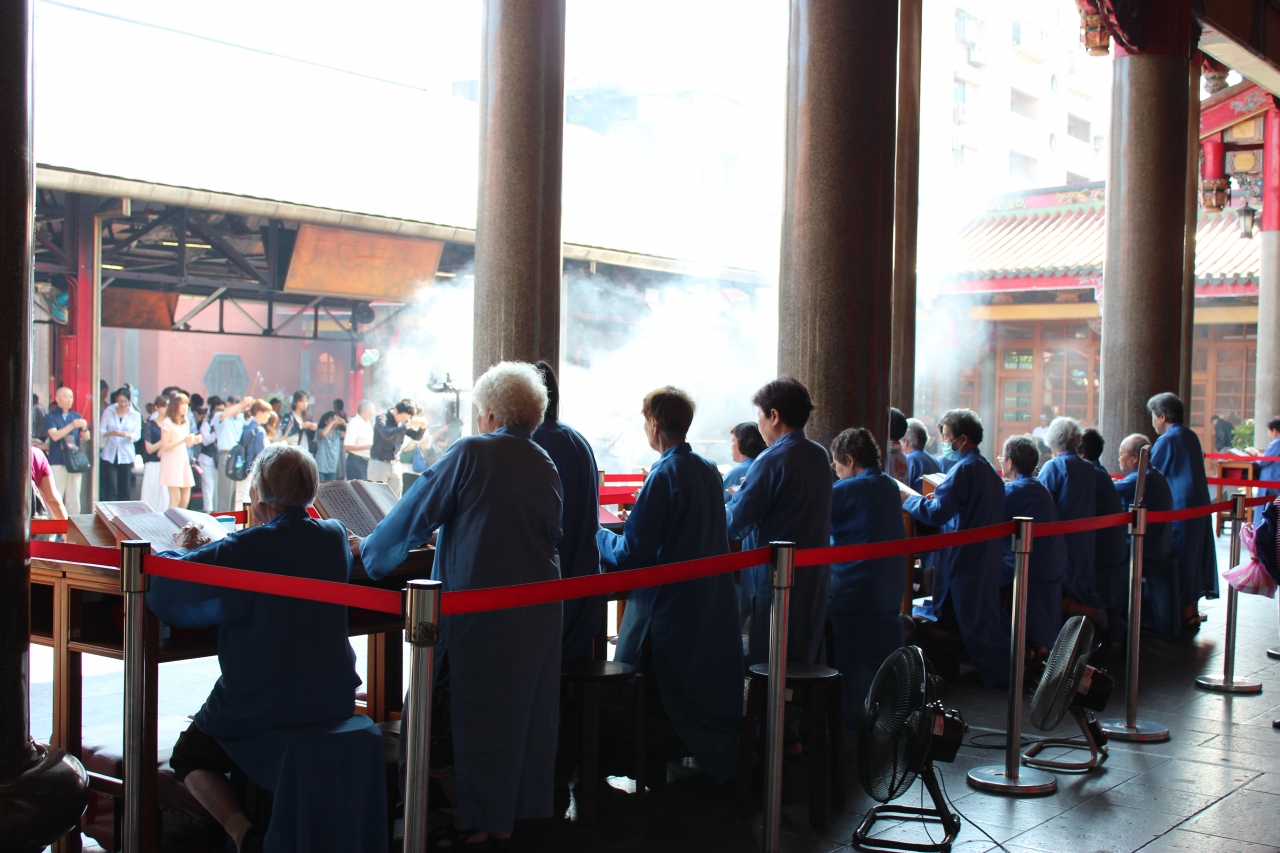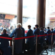 青い服を着たボランティアのおばあさんたちが、お祓いをしてくれますが、お昼前くらいからです。朝は揃ってお経を上げておられます。