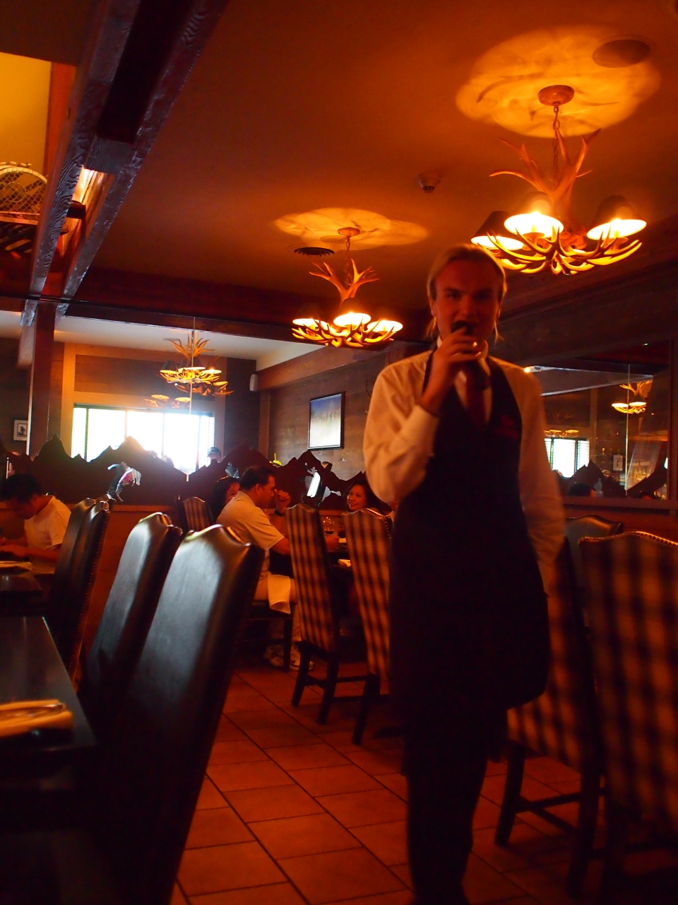 食事の最中、30-45分に1度、バーテンダーやウェイトレスの歌のサービス(カラオケですが)があり、テーブルをまわってきます。 なかなか面白いサービスだなーと思いました。 もしかしたら、歌をリクエストしたら歌ってくれるかも!?!?