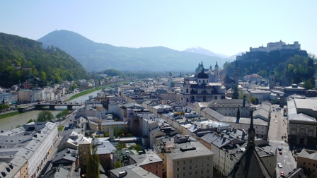 ザルツブルクは街全体が世界遺産の素敵な街。旧市街を囲むように祝祭劇場の裏側にある丘がメンヒスベルクです。ゲトライデガッセの終わりから少し北西方向に歩いた所に展望台に上るエレベーターがあり、これを使って展望台に上がることができます。そこからの景色はザルツブルク旧市街とホーエンザルツブルク城を一望できる素晴らしいものです。祝祭劇場のわきの階段から上にあがることもできます。