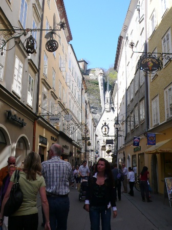 ザルツブルクの旧市街にあるショッピングスポットがゲトライデガッセです。幅3メートルほどの小路の両脇に鉄細工の看板をつけた店が並びます。マクドナルドの看板も鉄細工。ザルツブルクのおみやげを買うのに持ってこいのスポットです。