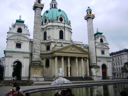 ウィーンのカールスプラッツを、作家マーク・トウェインがこれほど古典と近代が美しく共存している場所はないと言ったそうです。その古典の方がこのカールス教会。1739年完成のウィーンのゴシック建築の傑作です。2本の円柱が特徴的。内部のドームの天井画が美しい。冬には広場でクリスマスマルクトが開かれる。楽友教会の向かい。