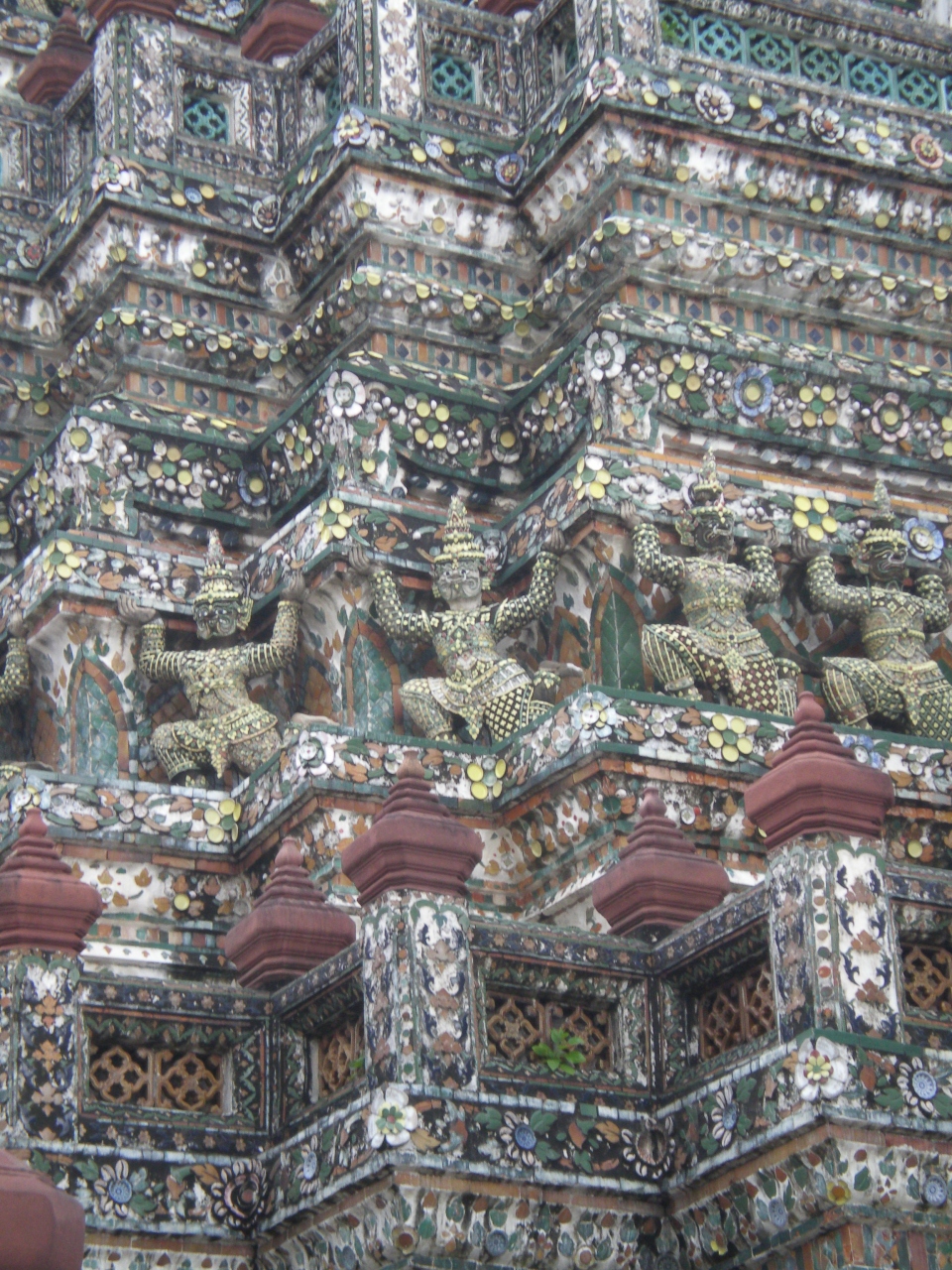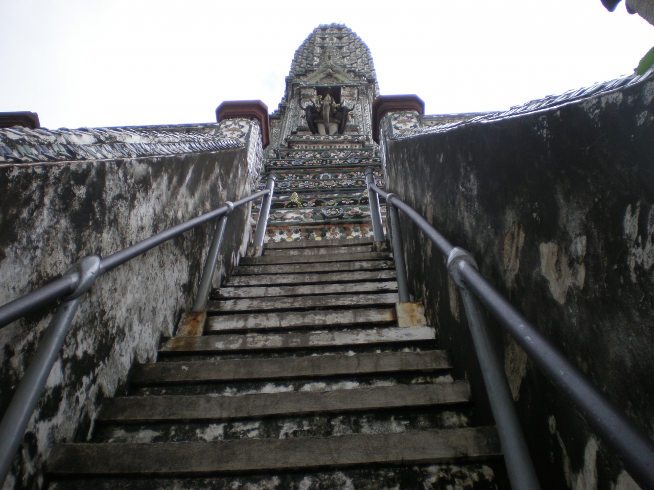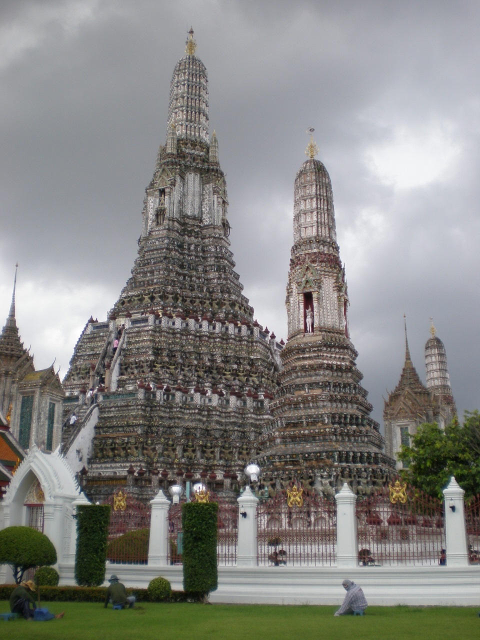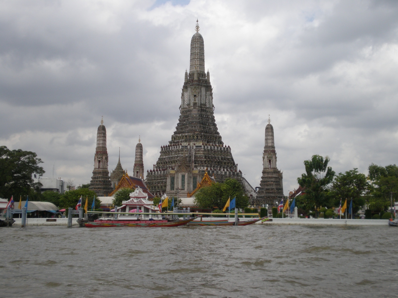 チャオプラヤー川の水がやけに高いなぁ…なんてのんきに不安定な空の下、船で揺られること10数分、5年ぶりに見る暁の寺院はあの頃のままでした。
