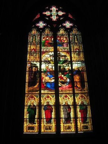 教会内部のステンドグラス、中央祭壇の右側の祭壇画も素晴らしいです。