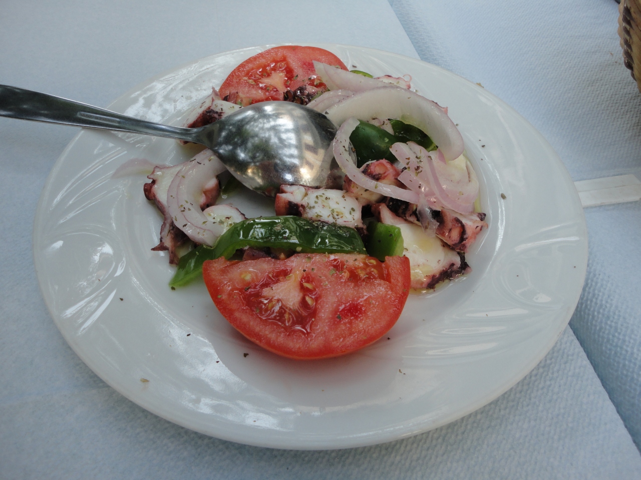 タコは、のお店に限らず、ギリシャ料理全般的に日本のタコの茹で方よりもちょっと茹で方が長いような気がします。つまり、ふっくらしこしこ柔らかというより、若干固め。しかし、オリーブオイルが美味いので、それも帳消しにはなります。