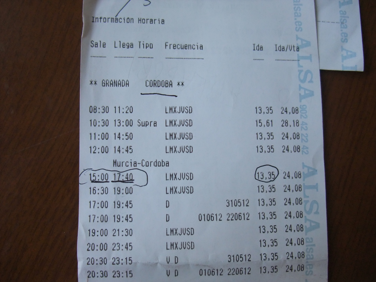 マラガからグラナダへ、グラナダからコルドバまでバスで移動しました。ターミナルで時刻表をもらいそれに丸をつけてキップを買いました。簡単に買えました。コルドバへは15時発に乗りましたが同じ時刻に3台出ました。すべて指定席でした。大体予定の時刻より早めに着きました。