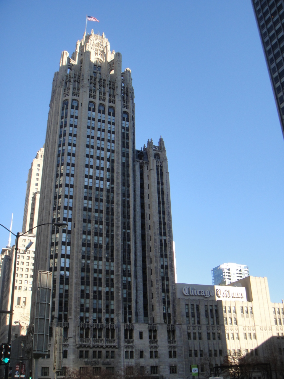 トリビューンタワーはシカゴを代表する新聞社シカゴトリビューン紙の本社ビルです。ミシガン通りの魅惑の1マイル、マグニフィセントマイルの入口、シカゴ川のすぐ近くにあり、シカゴ川にかかる橋の付近から見ると道路を挟んであるリグレービルと共に綺麗に見ることができます。高層ビル部分のすぐ右隣りに新聞社の名前が書かれていました。