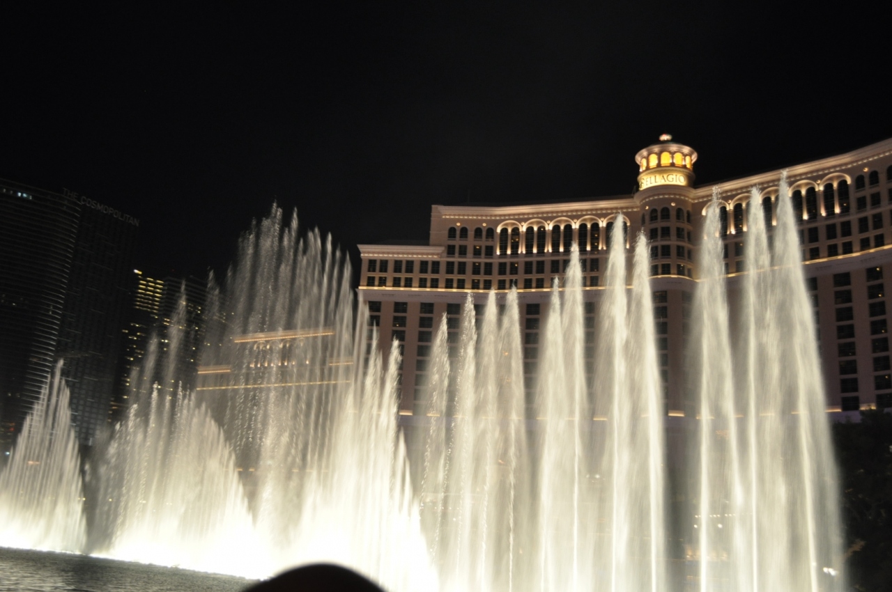 無料のショーで見ごたえ充分です。ツアーでラスベガスに一泊と言っても夕食後8時過ぎから翌朝出発までの短時間勝負なので、まずは噴水ショーを見物。ショーが始まる頃に人が大勢池の周辺に集まってきます。ベストポジションは何処かと悩みましたが、正面が一番いいんでしょうが何処からでも楽しめます。