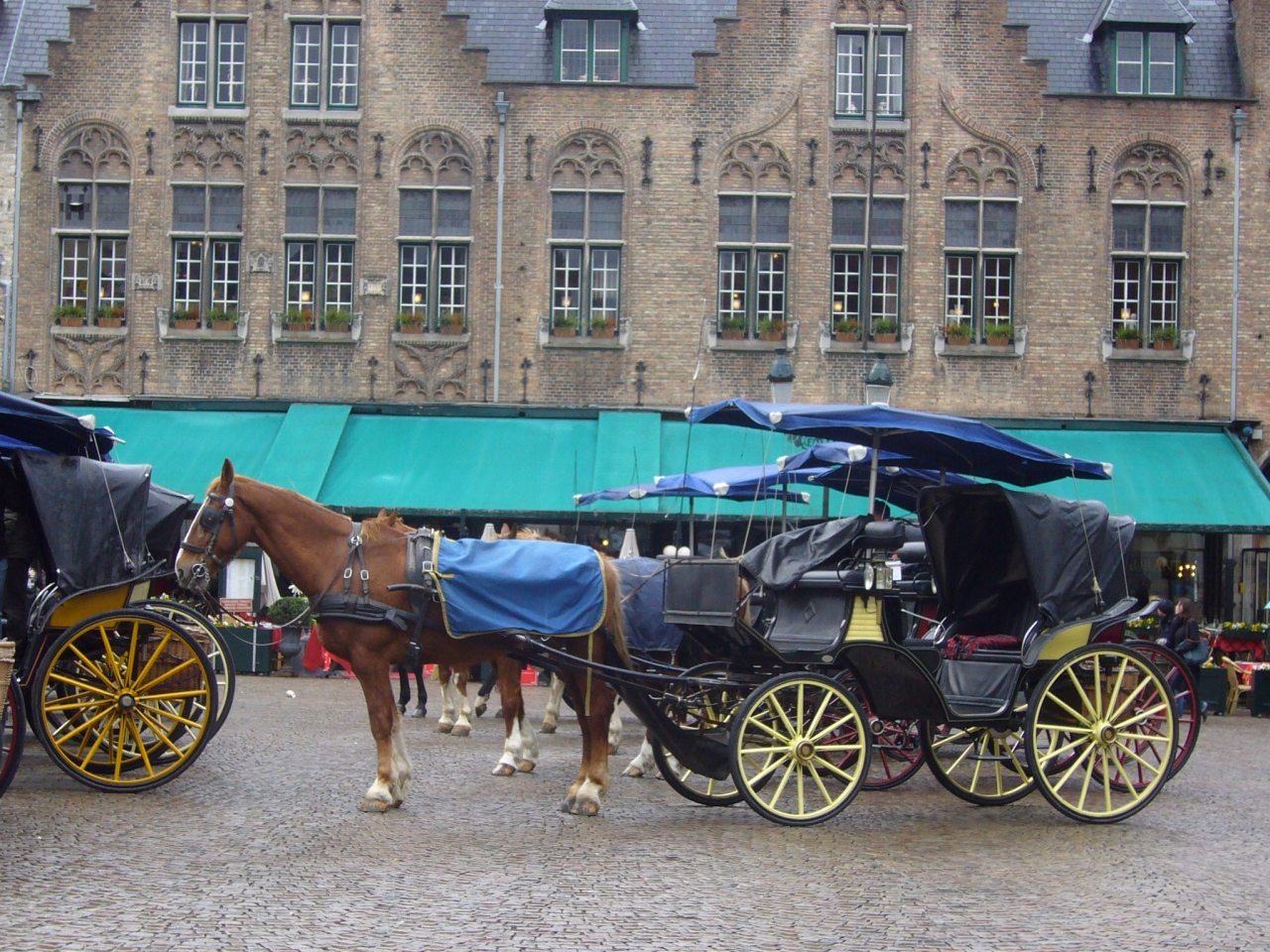 世界遺産にも登録されたマルクト広場は、ギルドハウスが立ち並び、今はレストランや、お土産屋さんになって、賑わっています。馬車などもここに何台も止まっているので中世に来たような感じです。中央には市民の英雄ヤンブレイデルとピータードコニングの像があります。