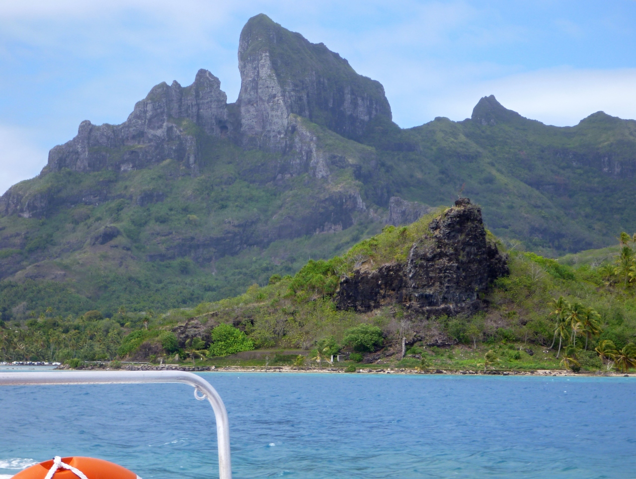 ボラボラ島の真ん中にそびえる山がオテマヌ山だと思っていましたが、2連山になっていて、若干低くて平らな頂上を持っている山がパピア山、後方に鋭い三角形に見える山がオテマヌ山です。山を取り囲むようにラグーンがありますので、島のどこからでもその威容を見ることができます。