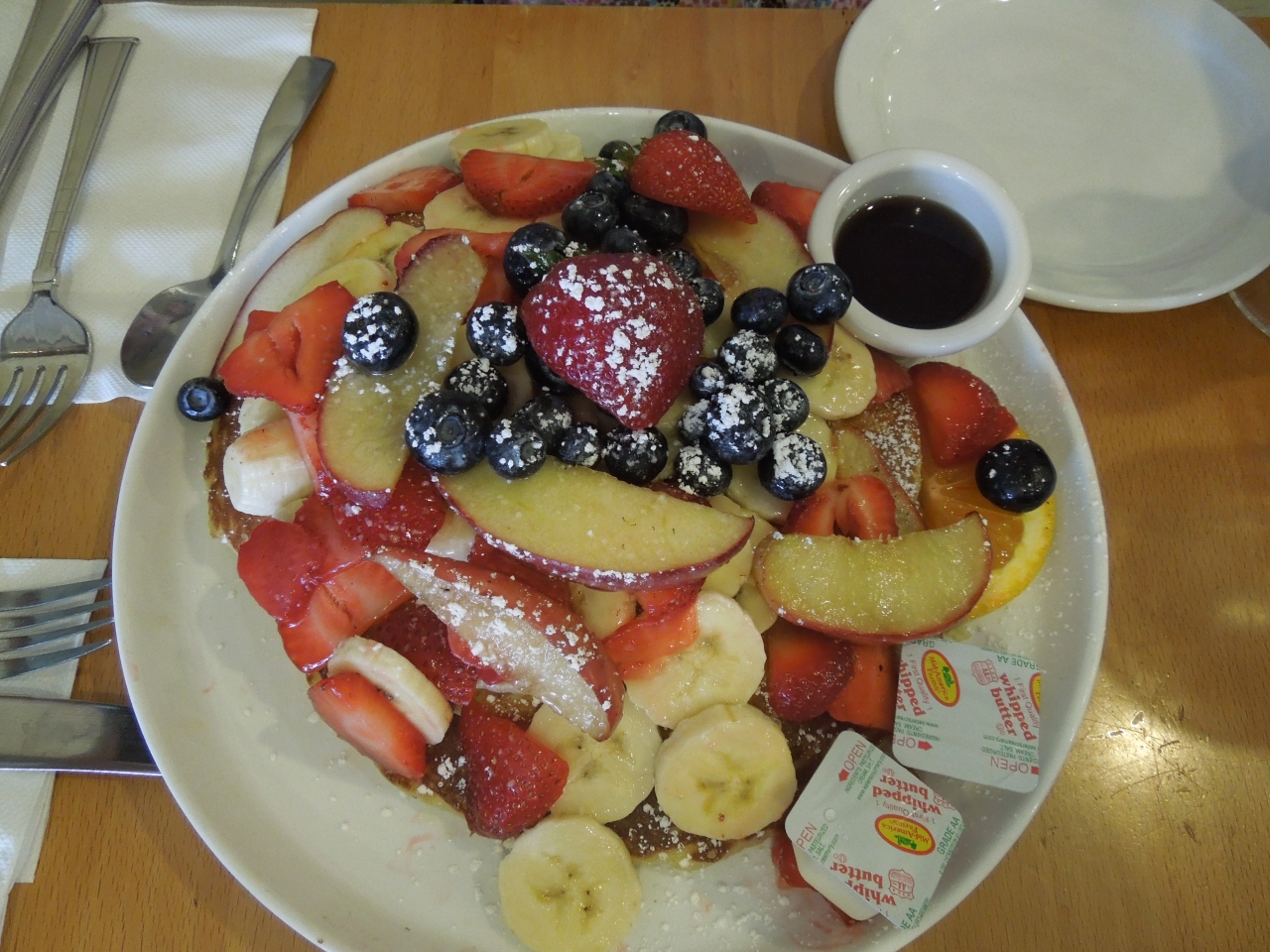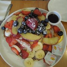 ワッフルとパンケーキにフルーツ(リンゴ、イチゴ、バナナ、ブルーベリー)全てトッピングしました。