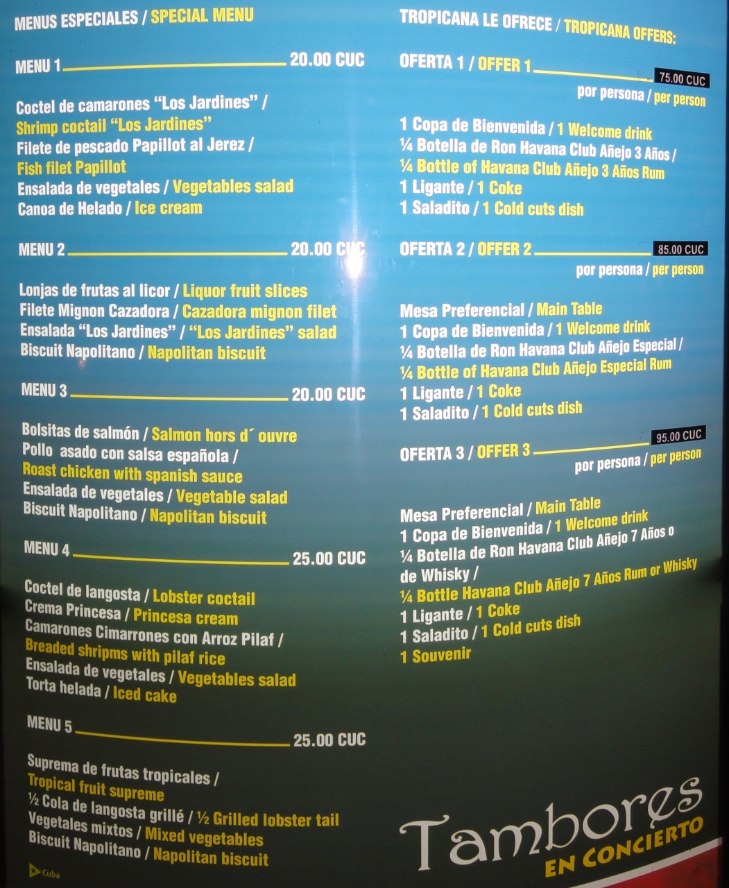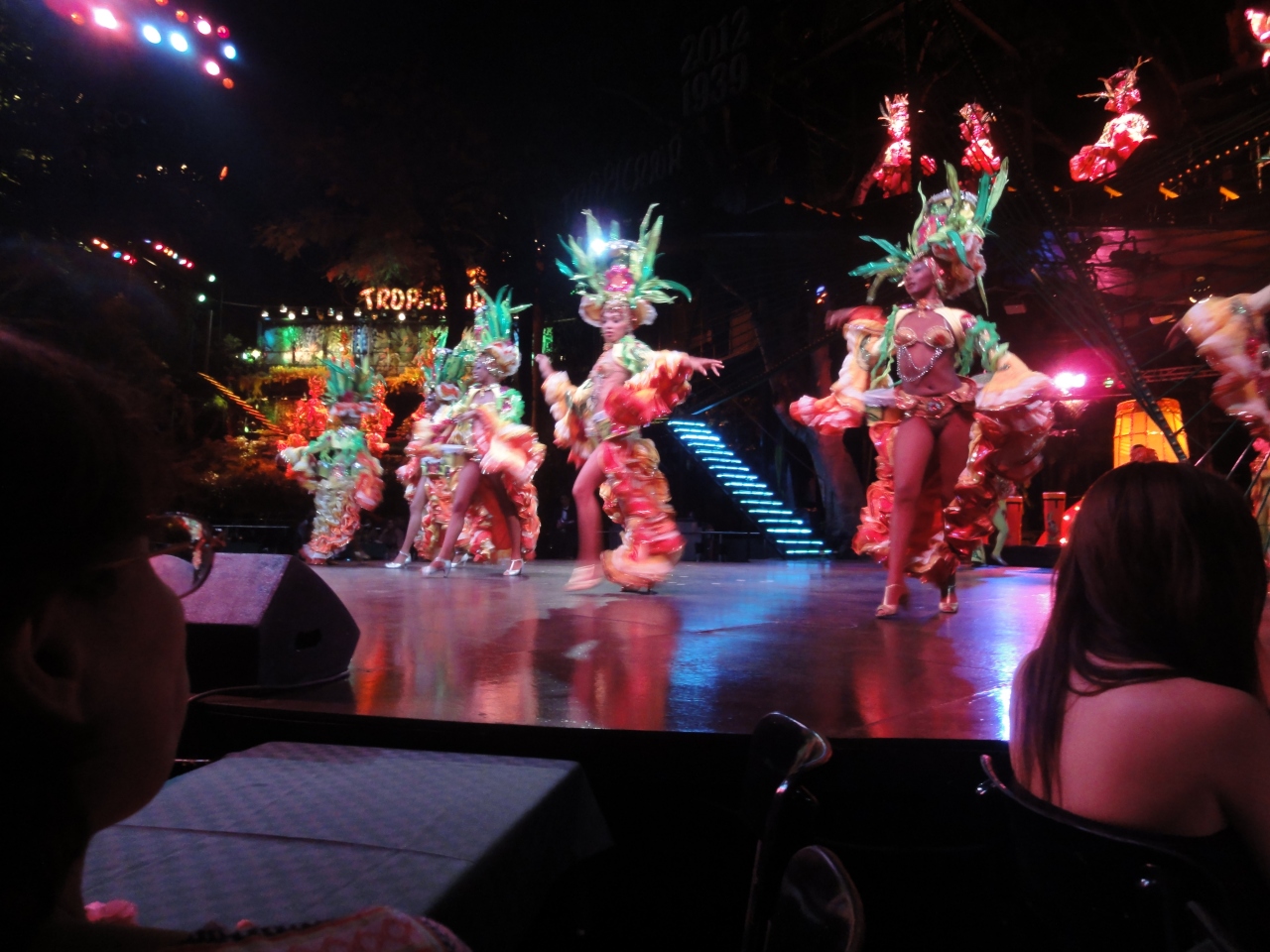 特別席での観覧+食事を申し込みました。食事は肉と海老料理の選択制ですが肉は堅くて歯がたたない。ワインを1ボトル頼みましたが29CUCでした。特別席は最前列で満足するものでした。ショー開始前後から飲み物(ラム酒、コーラ等)、つまみがボトル単位で運ばれてきます。出たものは持ち帰り可能です。最後に記念品が出る予定でしたがショーの半ばで豪雨になり45分位待ったあげく中止、そのためもらうことが出来ませんでした。帰りはタクシーがたくさん施設の前に泊まっているので困ることはありません。