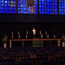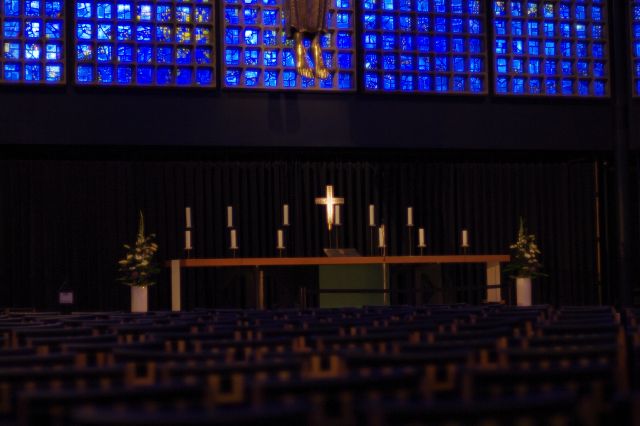 中は前面の青いステンドグラス、金属でできたキリスト像が浮いており今まで見てきた教会とはまったく違って見えました。不思議な場所なのでぜひいってみてください