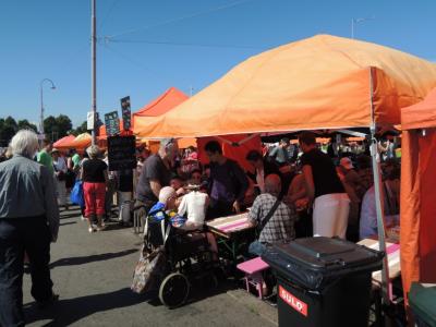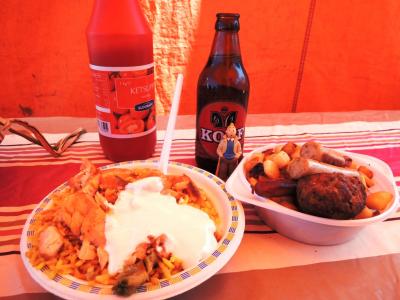 各店舗競うようにパエリアや焼きソーセージなどを販売しています。