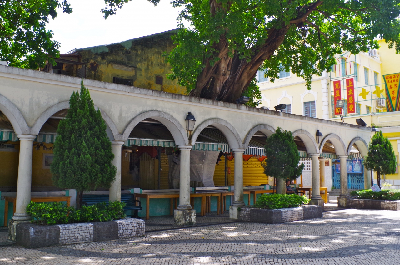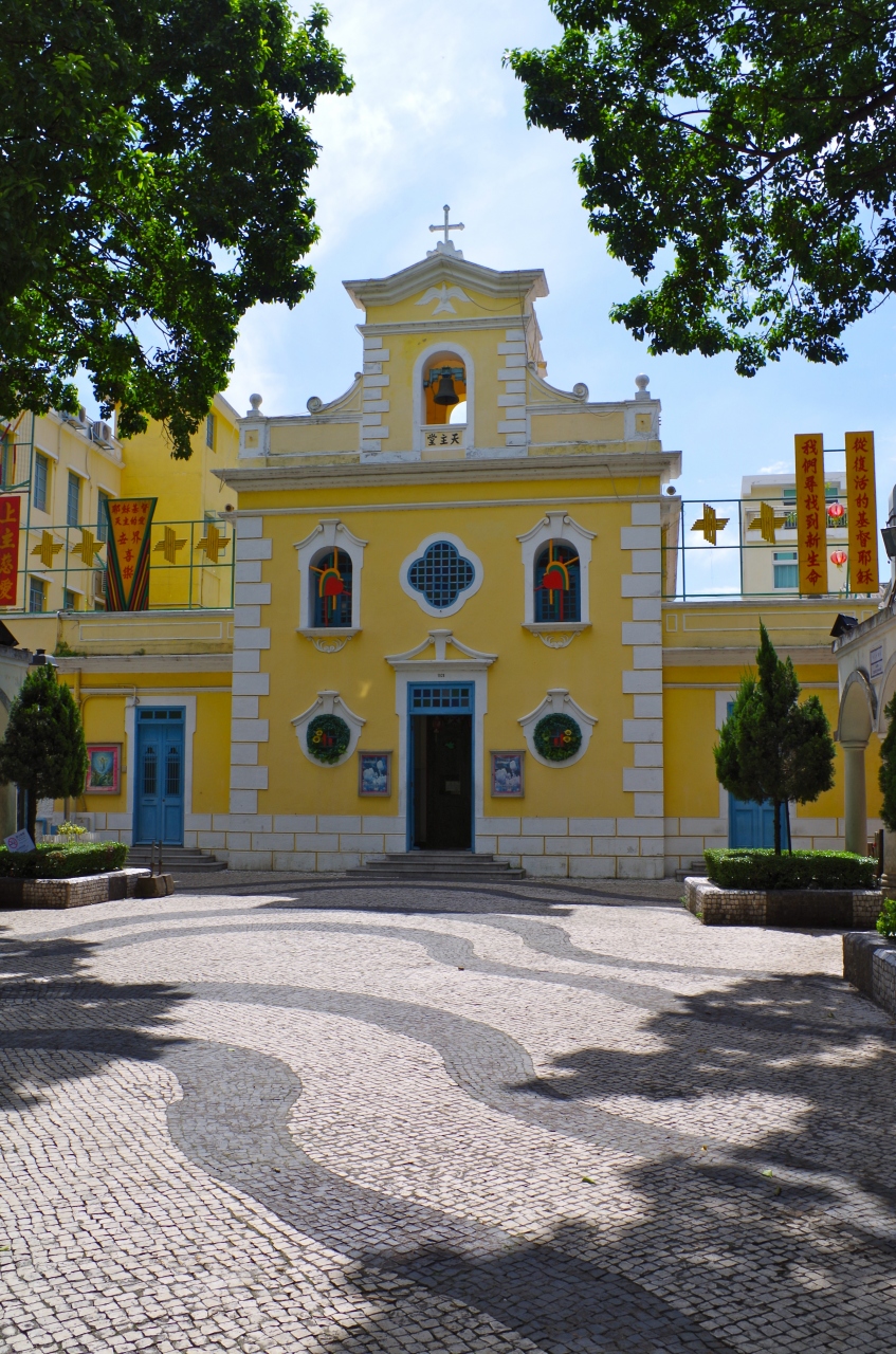 中には入りませんでしたが、黄色・白・青の可愛らしい建物に、黄色と赤の漢字で書かれた旗(?)などが掲げられていてる中洋折衷な外観はとてもマカオらしく感じました。教会前の広場は閑散としていて、観光客も少なかったです。