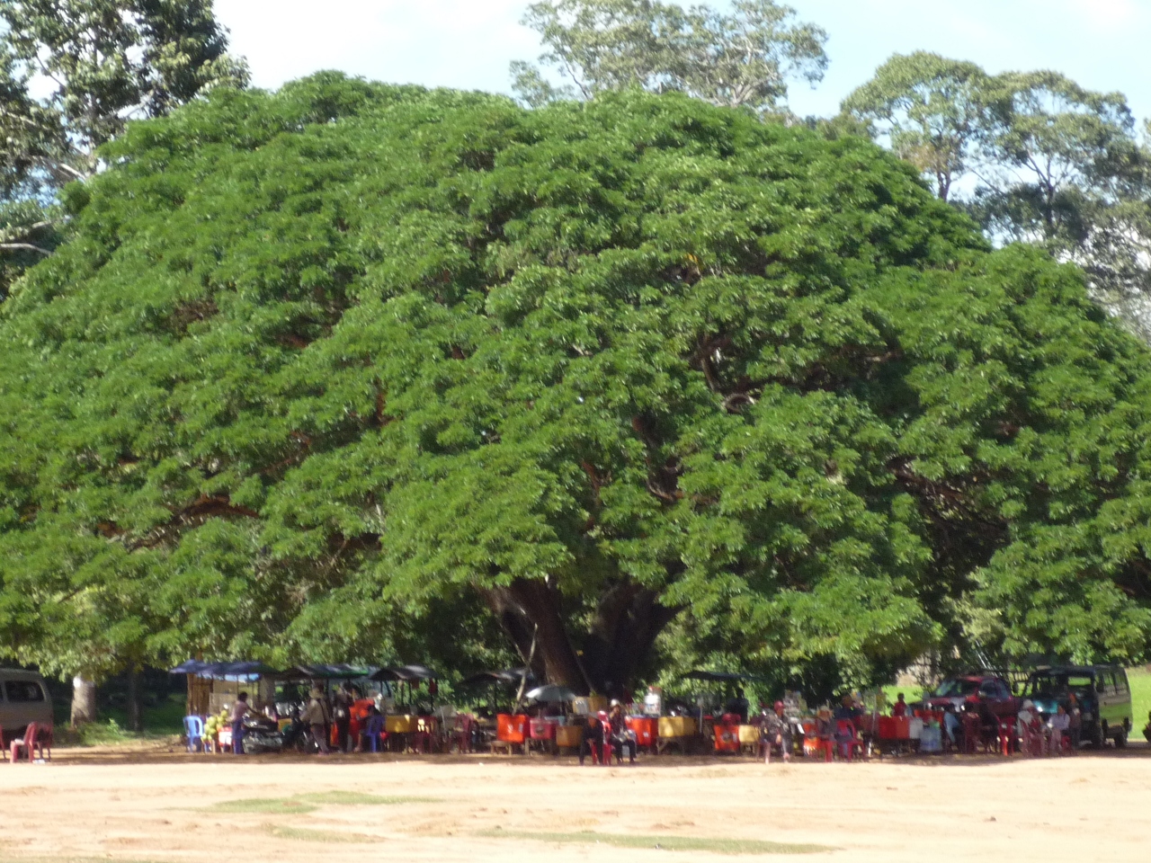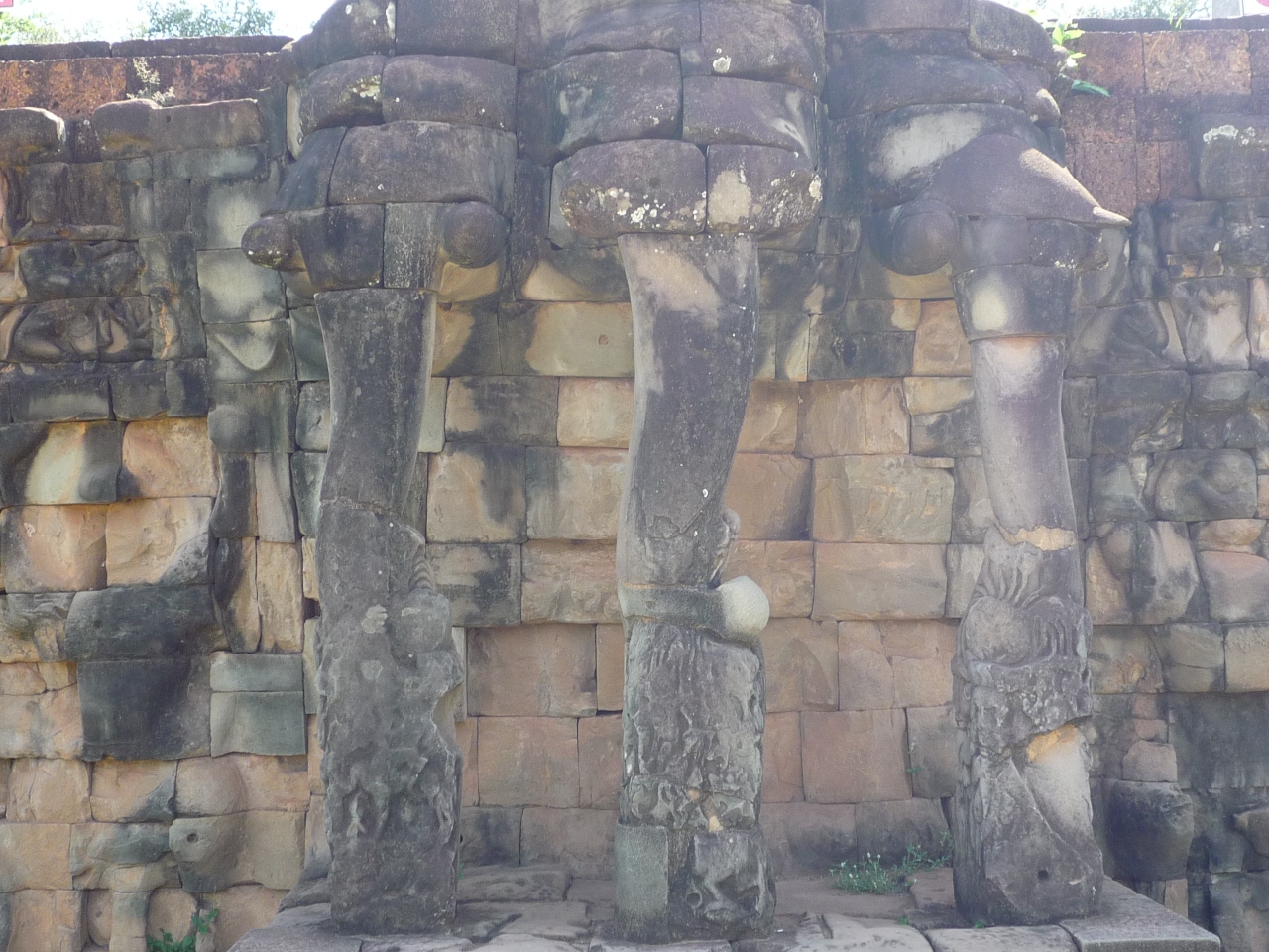 アンコールトムの中心バイヨンから西へ歩いて行くとまさにテラスといった感じの開けた場所に出てきます。テラス正面の壁一面には象の頭部が彫り込まれています。バイヨンではゴツゴツした岩山に人の顔顔顔でしたが、象のテラスは平な所に象象像といった感じです。テラス自体は3~4mの高さですが、王宮広場の眺めがとてもよく、正面に見える緑豊かな大きな木がとても印象的でした。