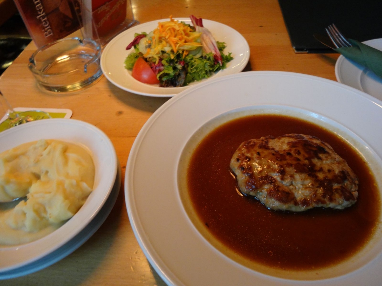 子牛のハンバーグを注文。サラダとマッシュポテトが付いている。日本のハンバーグとは違って肉の旨みを存分に感じられる。