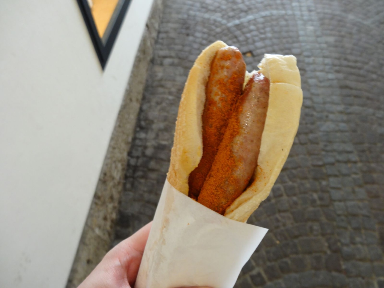 モーツァルトの生家のある通りから路地を入ったところにある常設の屋台のようなホットドック店。ボスナというバルカン地方のホットドックらしい。