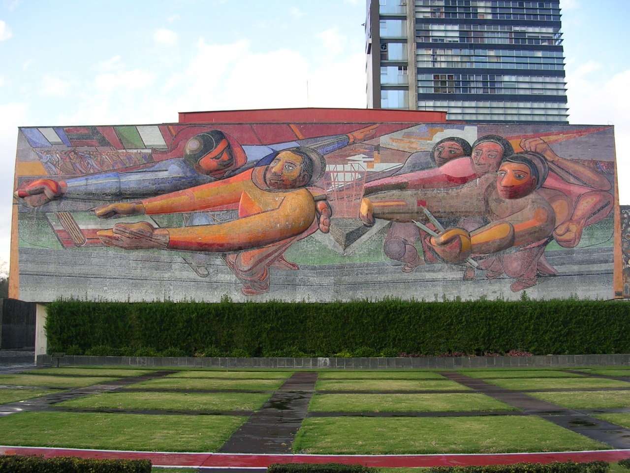 まず、大学中央図書館全面に描かれたモザイク画が目を引きます。また、校舎に建物から飛び出た絵や、「民衆から大学へ、大学から民衆へ」という題の立体壁画作品などがあります。いずれもメキシコを代表する芸術家の作品で、色使いや雰囲気がいかにもメキシコらしいです。