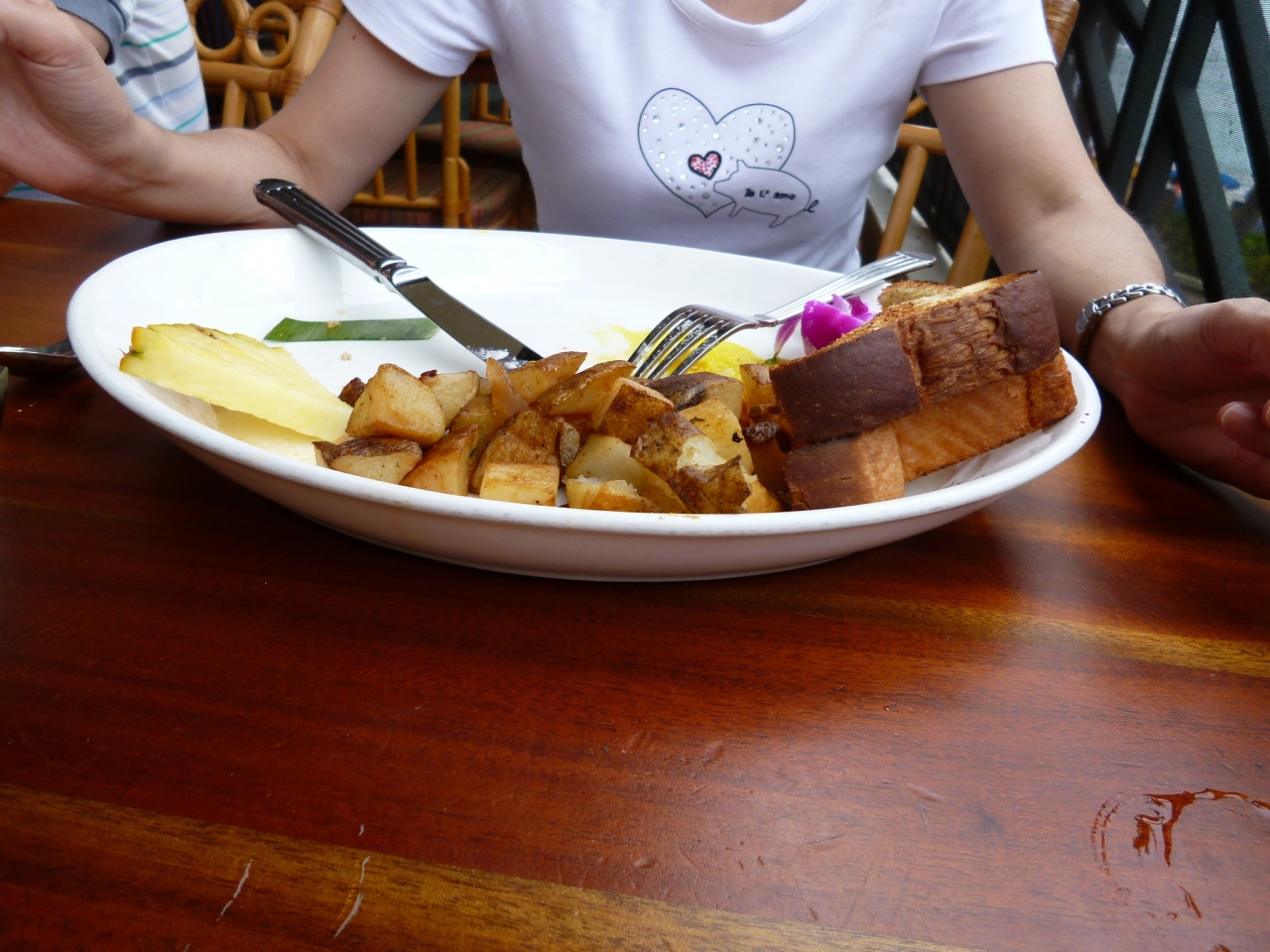 事前にインターネットで予約してあったからか、結構混んでいましたが海側のテラスに案内してもらえました。日本語は通じませんが、朝食を頼むぐらいはどうにかなりました。