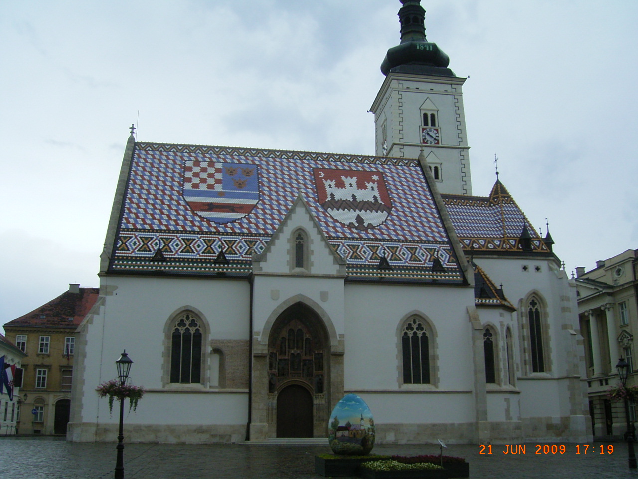 13世紀にはあったようです。教会の屋根はモダイクで2つの紋章が表されています。向かって左側はクロアチア王国紋章で、右側はザクラブ市の紋章です。内部もバロック様式の豪華な装飾品のある作品が飾られています。