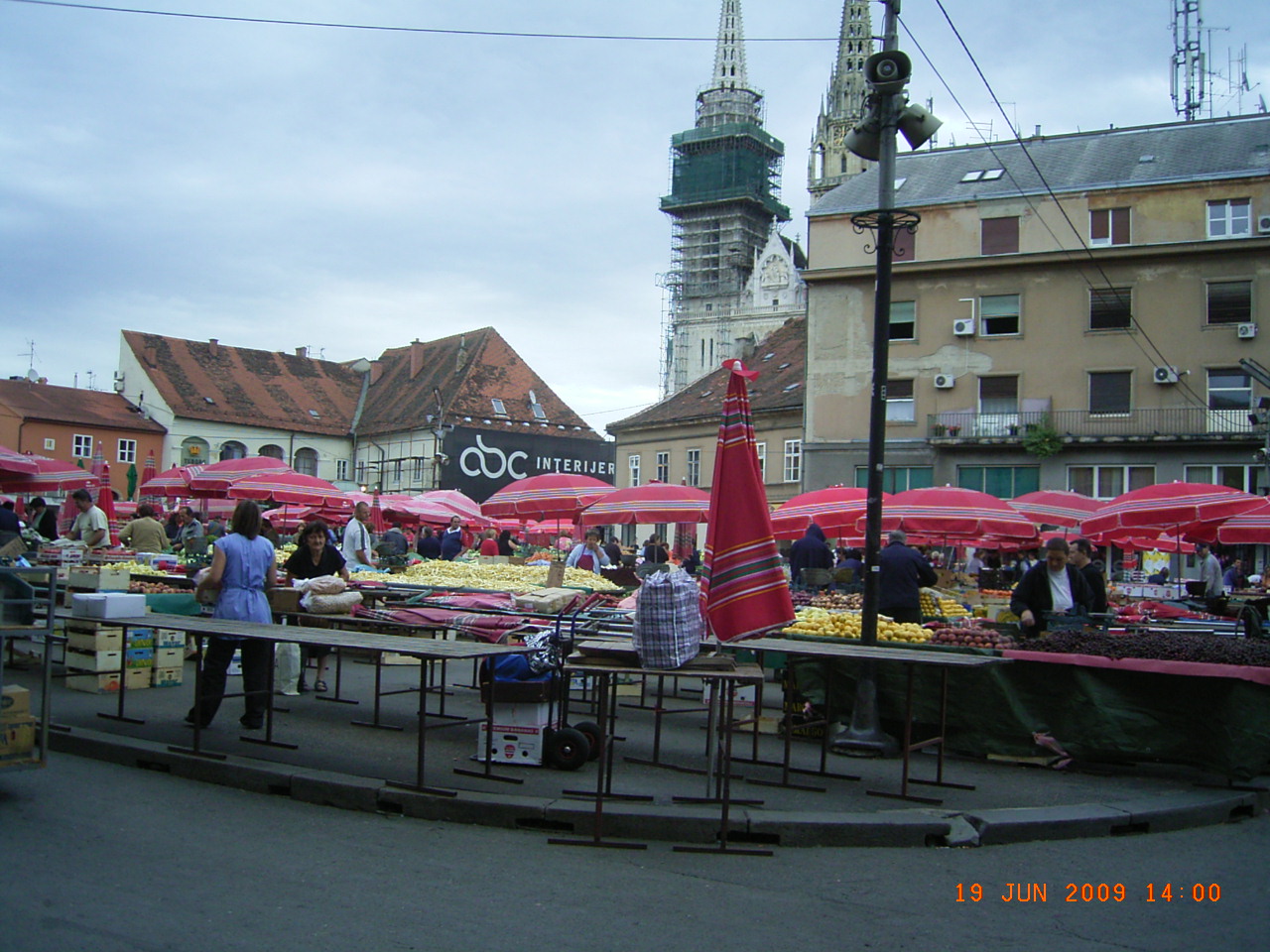 イェラチッチ広場から階段をあがると青果市場に着きます。朝から新鮮な野菜やチーズ、卵や花などが売られています。見ていると声をかけられ、チーズなどを試食させてくれました。近くは飲食店などもあります。下町の雰囲気です。