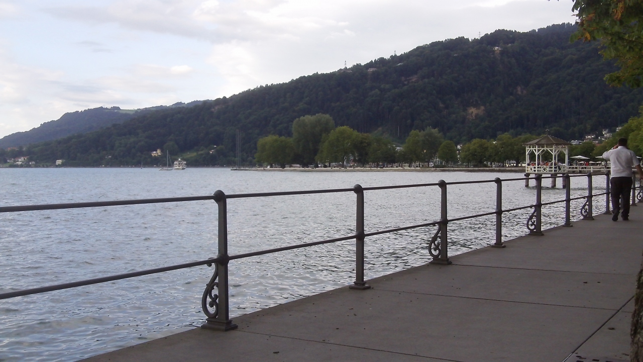 ボーデン湖は、オーストリア、ドイツ、スイスにまたがる美しい湖です。ブレゲンツからの眺望でお勧めなのは、当地がボーデン湖東端に位置するため、日没の美しさがあげられると思います。この利点を利用して、ブレゲンツ音楽祭の湖上オペラも始まったと思いますし、湖上オペラの開演時刻は、日没時刻となっています(7月は21時10分、8月は21時開演)。湖畔の歩行者用の道路もベンチも混んでいないので、朝夕の散歩に適していますし、歩くだけでリフレッシュできます。