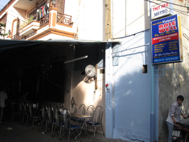 バーレー井戸(ホワイトローズを作るのに必要な井戸水を今も汲んでいる)を見に行った時に見かけて、某サイトで評価が高いのを見て食べに行きました。バーレー井戸のある、小道の角にある青い「Bale Well」という看板。朝通ったときにはハーブを洗ったり、下ごしらえ中でしたが、午後に行くと炭火でサテー(焼き鳥・串焼き豚)を焼くいいにおいが漂っていました。見た目からして、「きれいな店でないと入れない、エアコンがないといや」という方には入りにくい店だと思いますが、NYTimesのレビューにも紹介されていたりして、欧米人の客はけっこうきているようです。