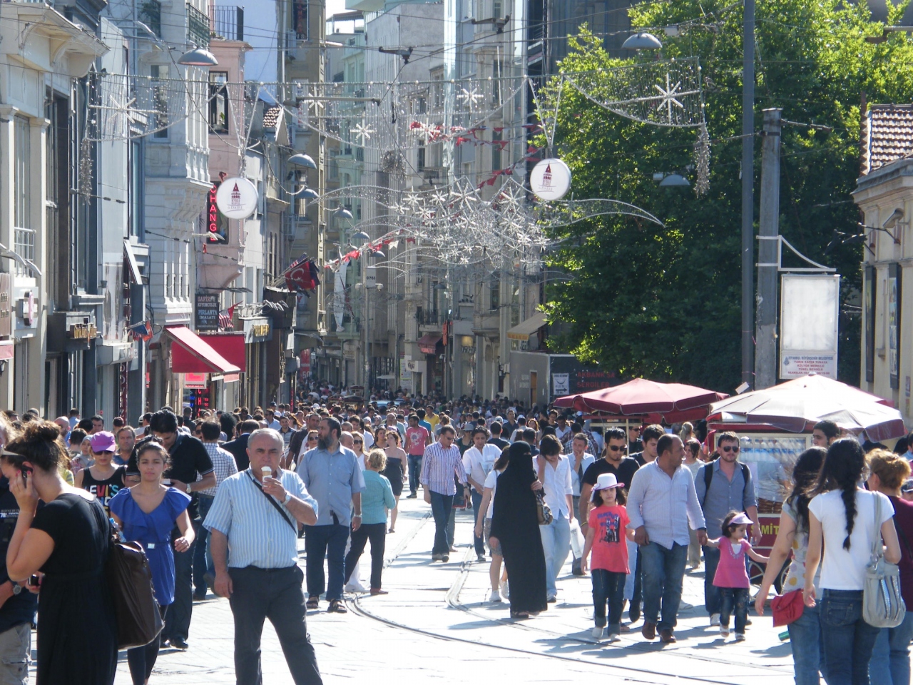 タクシム広場から南にイスタンブール随一の繁華街イスティクラル通りが1.5km伸びている。車の乗り入れが禁止され、レトロなトラムが往復している。両側にはヨーロッパスタイルの建物が多くお店やレストランが並び、ウインドショッピングの楽しいところである。