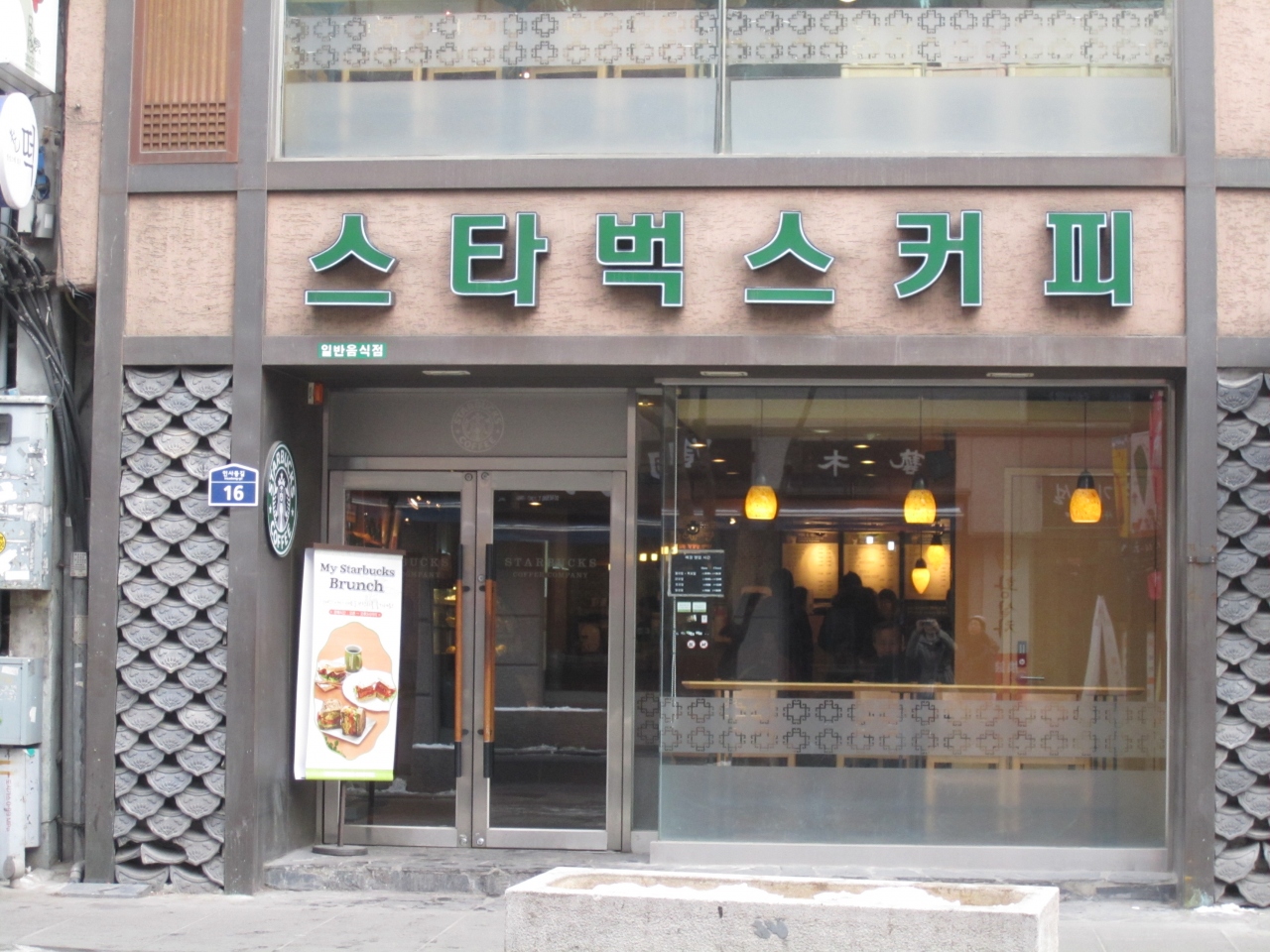 ポシャギが好きで、何かいいものが無いかな~と散策しました。面白いお店もたくさんあり、お土産ものから昔からのジモティのお店までありました。新しいアーティストが作品を作って売っているところもありました。買い物がメインだったため写真が無く仁寺洞ストリート近くのハングルのスタバの写真をアップします。半日いても足りないくらいです。