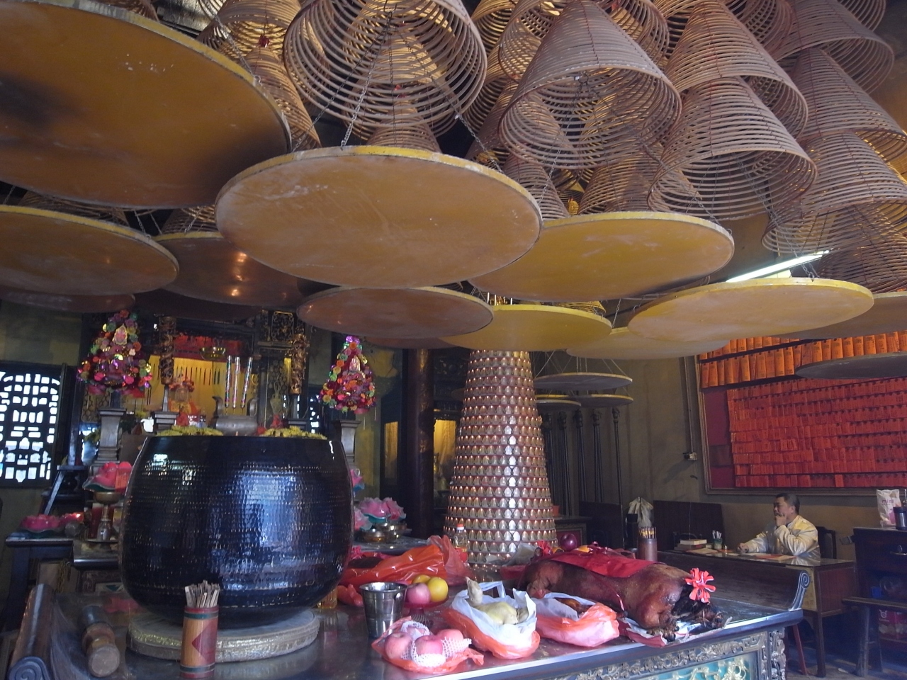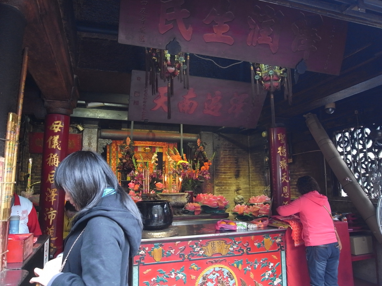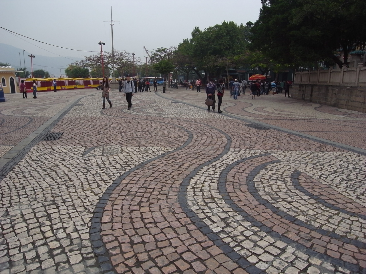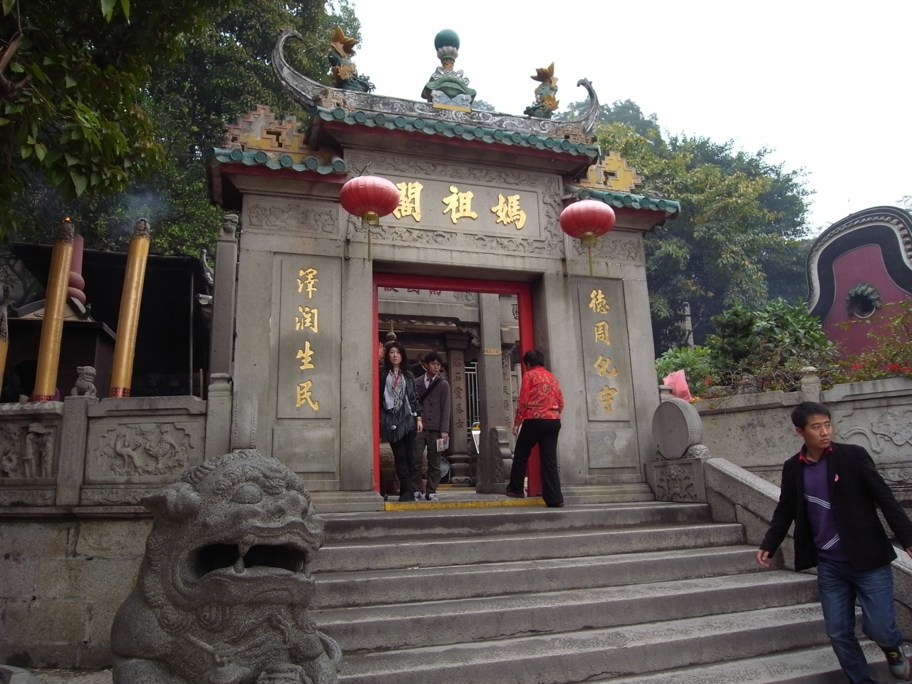 参拝者がいつも多いと言われている媽閣廟。旧正月前というのもあり、とても混雑していました。ゴツゴツとした岩が並び、阿媽を載せた伝説の船が描かれた岩があります。また、入り口前の広場がとても広々としたスペースで、石畳はバラの模様になっています。