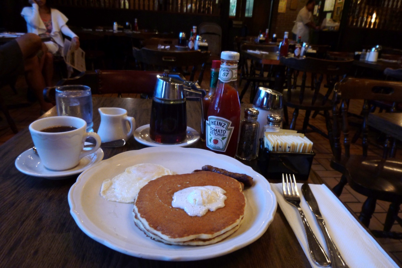 私は卵料理とソーセージにパンケーキがついてるものにしました。$5しません。