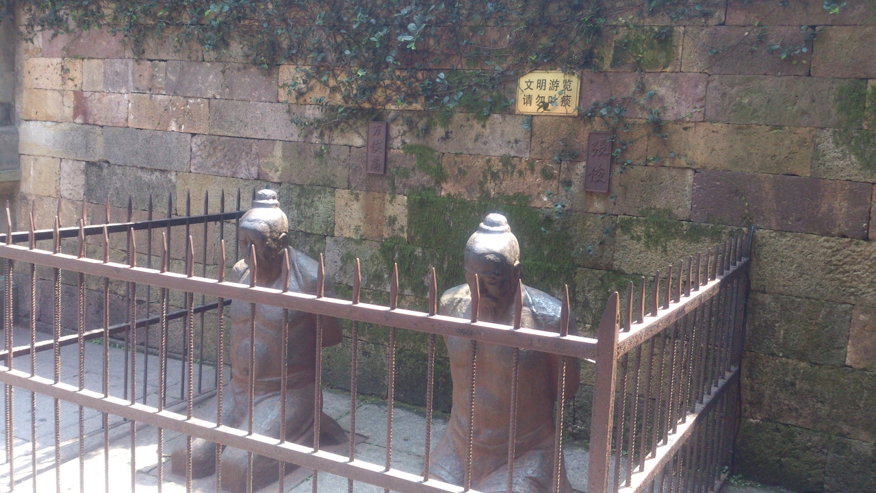 岳飛は中国では、関羽と並ぶくらい人気があり、ここにはたくさんのお参りがあります、その将軍を裏切ったということで、この像に中国人の方は、ツバをかけたりするそうです(僕が見た時はツバをかける人は見てませんが、ペットボトルで頭をコンコンたたいている人はいました)。