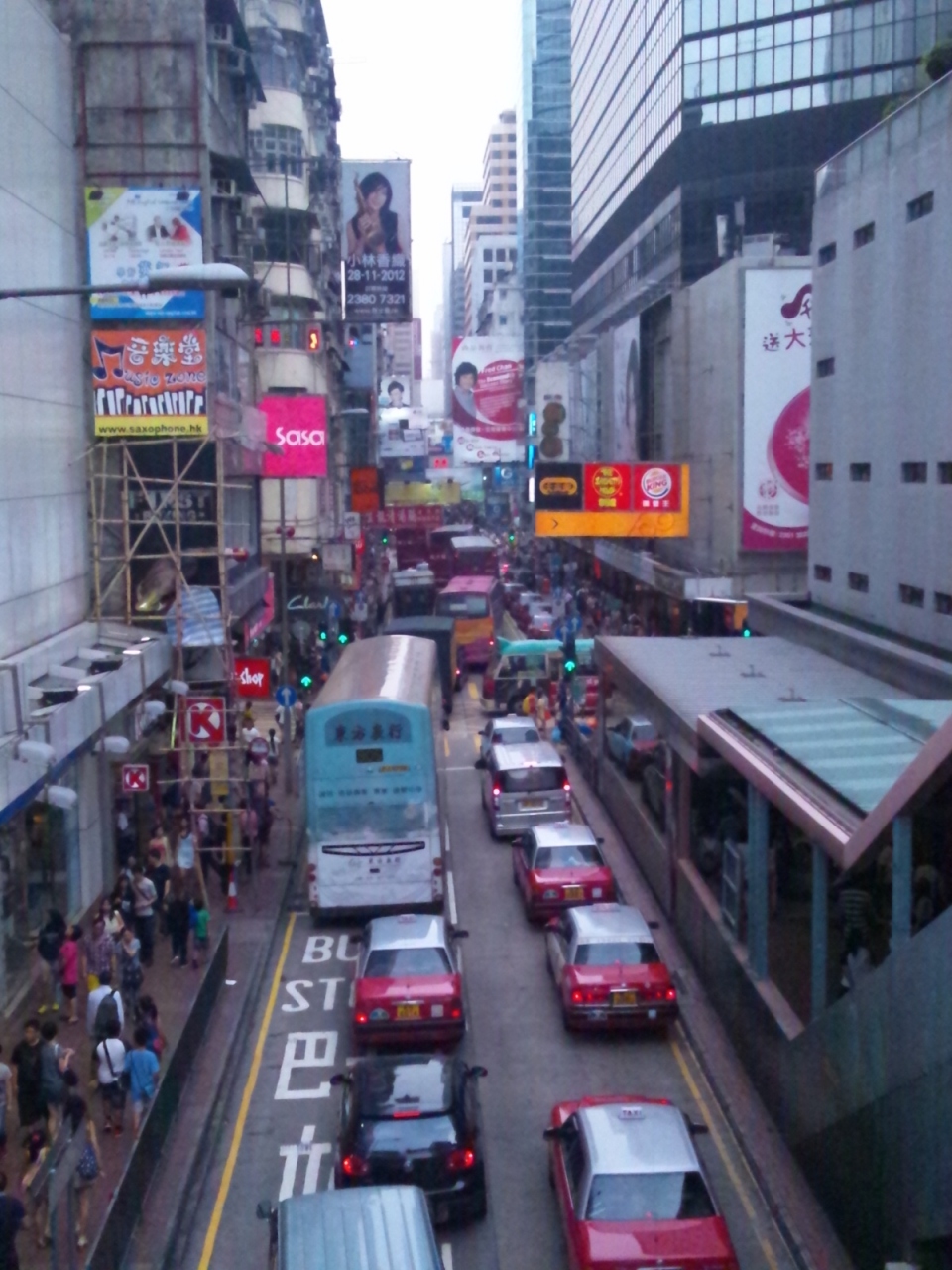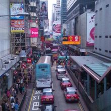 旺角の駅の上からの写真です。人も車も混雑していました。昼も夜も混んでいて、近くに電気街やら女人街、靴屋街などがありました。