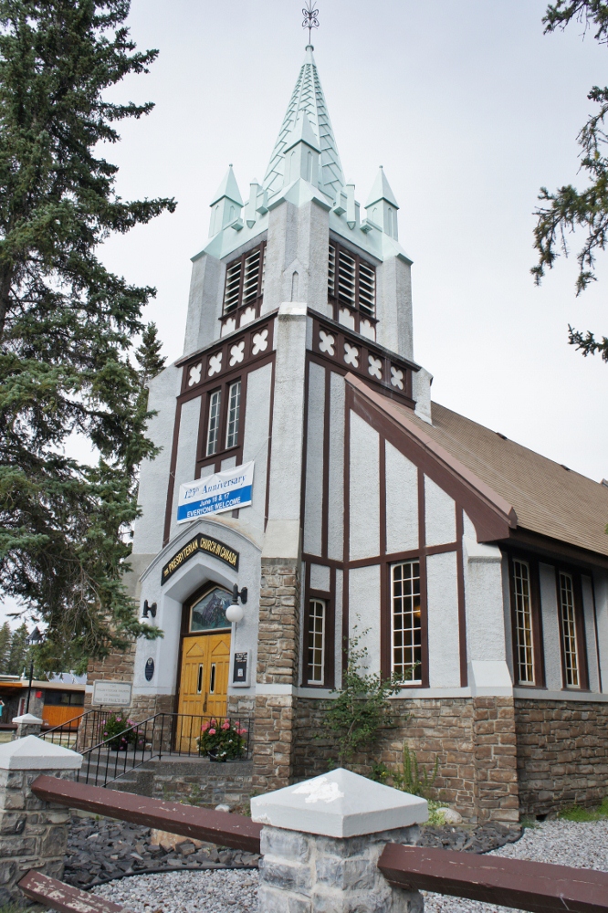 バンフ通りとウルフ通りの角に建つ教会です。教会にかけられた垂れ幕によると、今年で125周年を迎えるそうです。木組みの窓や飾りが用いられた教会で、山岳リゾート「バンフ」の街並みに、しっくり溶け込んでいます。