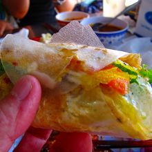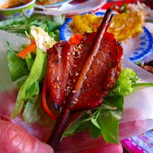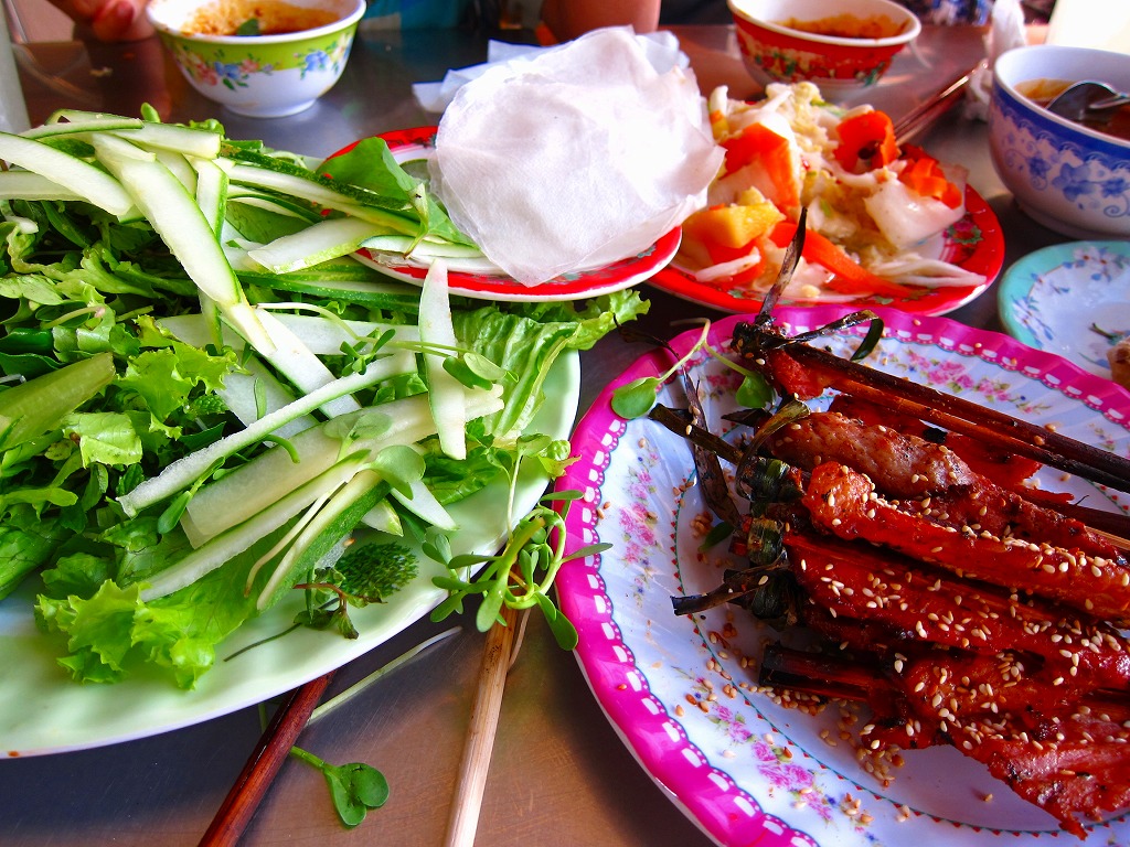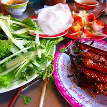 バーレーウェルに近い路地にあるローカル向けのレストランです。路地に置かれたテラス席に座るやいなやハーブの籠とライスペーパーがどかっと置かれ、あとから串焼き豚、鶏、バインセオなどがいろいろ出てきます。ライスペーパーにハーブ類(普通の雑草みたいなのもあります。)、白菜の漬物、肉を巻いて頬張りますとこれがビールによく合う。巻き方はおばちゃんが実演してくれます。ヘルシーなお食事をお腹いっぱい食べて明朗会計8万ドン(320円位)なんですから。