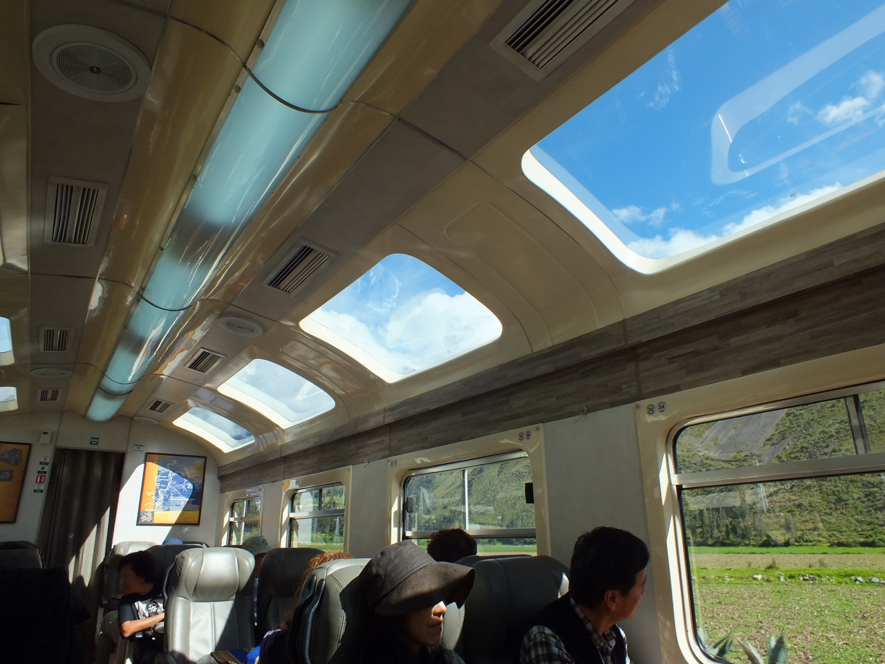 クスコからマチュピチュへ向かうのに楽しみにしていたビスタドームに乗りました。時期的にポロイ駅からは運行していなかったのでバスでオリャンタイタンボ駅まで行ってそこから乗りました。バスは駅を利用する人専用です。ガラス張りの天井から景気もよかったですし、楽しい列車の旅でした。