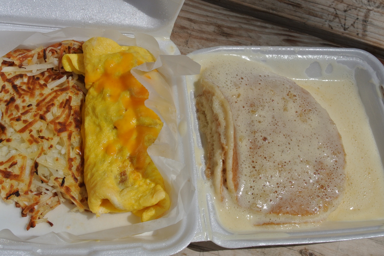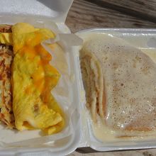 レンタカーを借りて、1時過ぎくらいに行きました。既に店舗前はお客さんでいっぱいです。店内で受付すると、店内での飲食はもうだめで、テイクアウトのみ可能とのこと。お目当てのマカダミアナッツソースのかかったパンケーキと、ハムとチーズのオムレツを注文して、近くのビーチで食べました。どちらもとっても美味しくて、来たかいがありました。